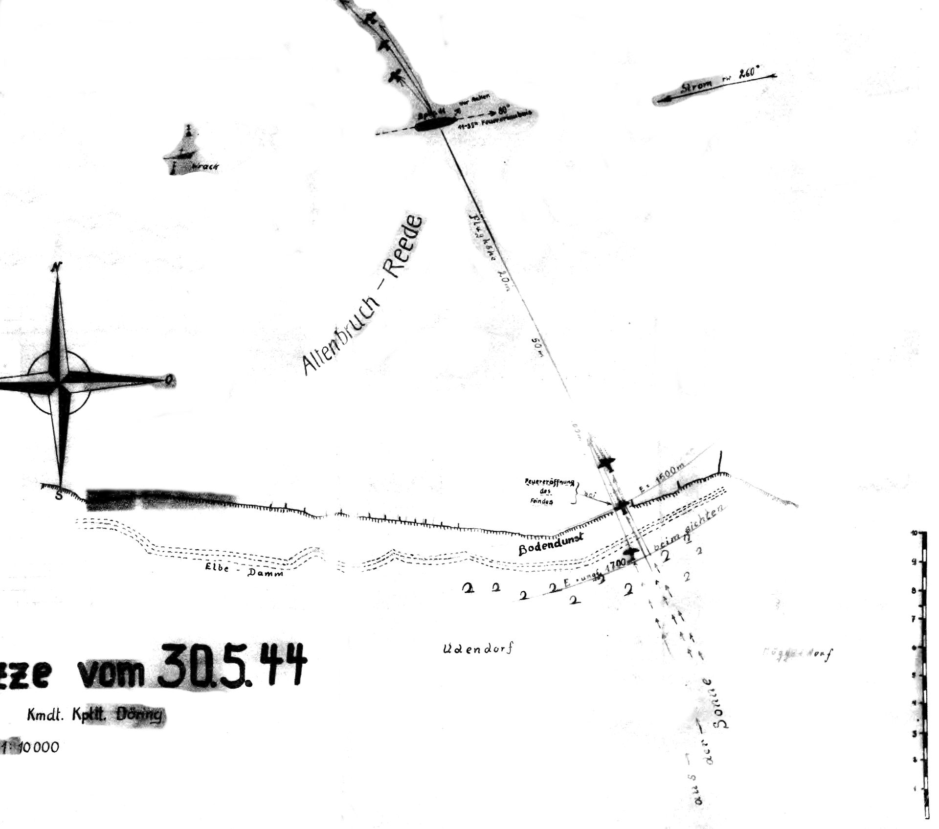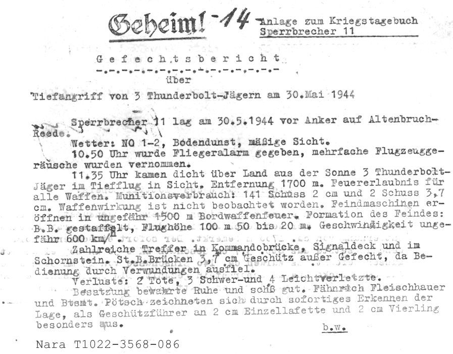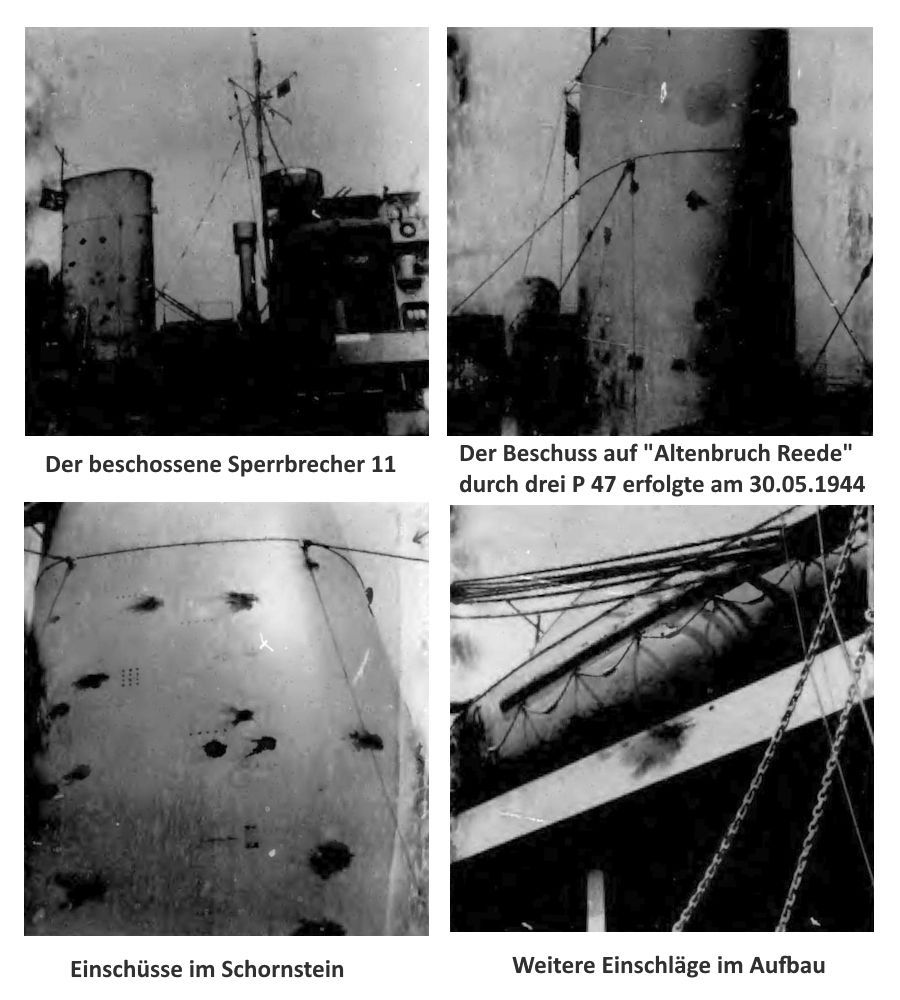 Am 30.05.1944 griffen drei amerikansche P47 Thunderbold den auf Altenbruch-Reede liegenden Sperrbrecher 11 an. Sie flogen aus der Sonne kommend über den Deich bei Udendorf auf das vor Anker liegendes Ziel zu. Die Geschosse der Bordwaffen der Maschinen durchschlugen während des Beschusses das nur wenig gepanzerte Schiff. Dabei wurden 2 Seeleute getötet, weiterhin gab es 3 schwer- und 2 leicht Verletzte Marineangehörige. Wie sie gekommen waren, verschwanden die Jagdbomber auch wieder, wobei keines abgeschossen wurde. Neben den Schiffen hatte auch die bei Udendorf liegende Scheinwerferstellung den Angriff offensichtlich zu spät bemerkt und nicht mehr eingreifen können.