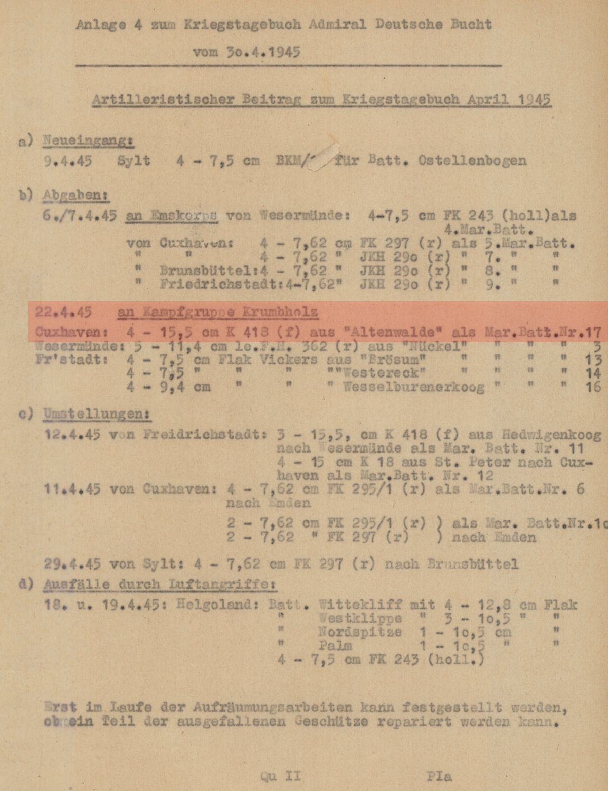 Am 22.04.1945 wurden die 4 Geschütze aus Altenwalde abgezogen und der Kampfgruppe Krumbholz zugewiesen. Diese war im Raum Bremervörde - Lamstedt zur Verteidigung gegen die vordringende britische 51th Division aufgestellt worden. Im Verlauf der Kämpfe, wurde mindestens eines der Geschütze zerstört. Mit Verlegung der Batterie Altenwalde zur Gruppe Krubholz, wurde sie in Marine-Batterie-Nummer 17 umbenannt. (Quelle: RM_45_II_124_0355)
