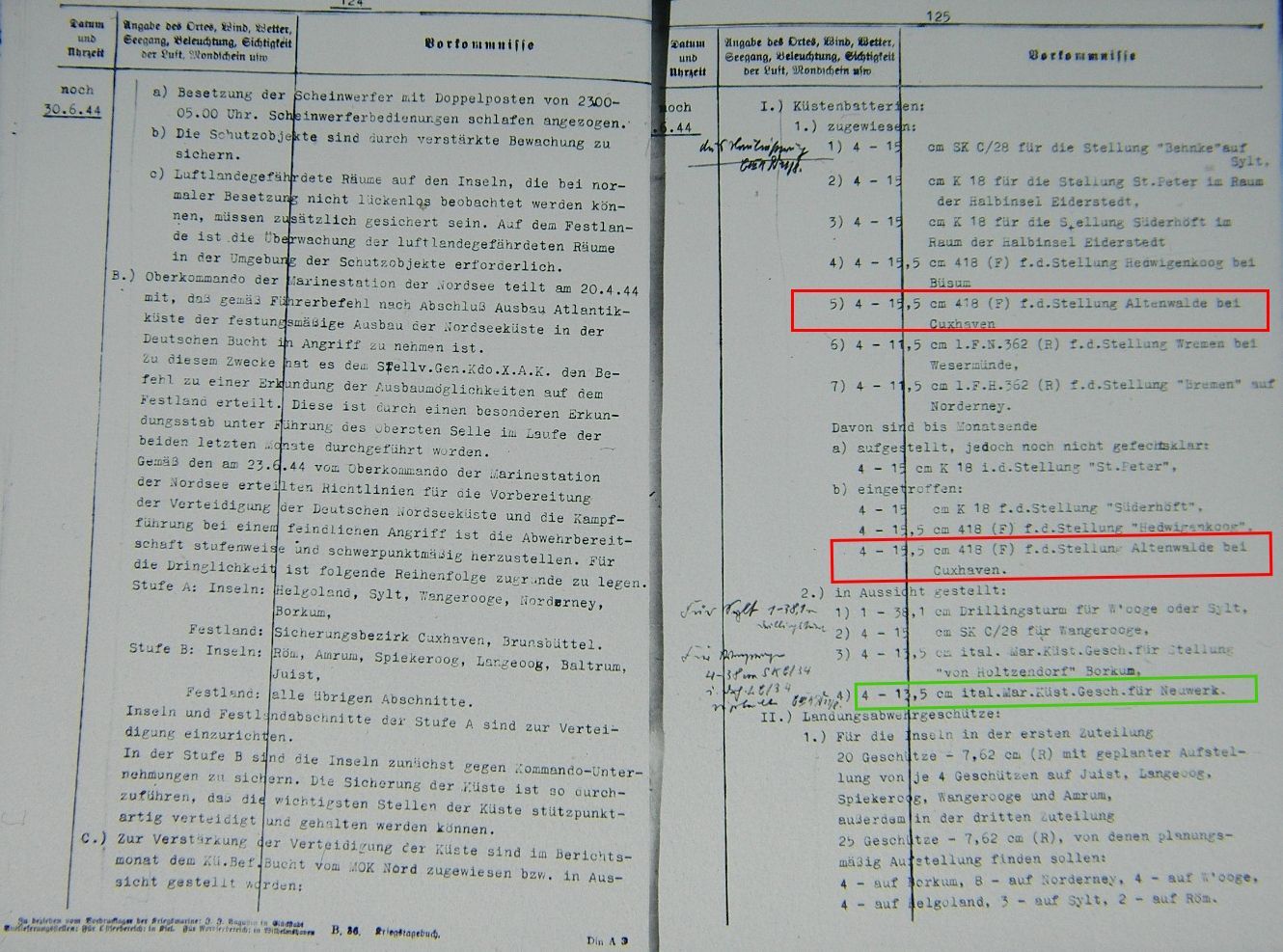 Mit Befehl des Oberkommandos der Marinestation der Nordsee am 20.04.1944, begann nach Weisung aus Berlin der militärische Ausbau in der deutschen Bucht. Zu diesem Schritt kam man, da eine Invasion der niederländischen und deutschen Nordseeküsten durch die Alliierten kategorisch nicht mehr ausgeschlossen werden konnten. Daraufhin entschied man sich, den betroffenen Küstenstreifen mit verschiedenen Baumaßnahmen festungsartig auszubauen, um einen seeseitigen Angriff gegebenenfalls abwehren zu können. Darunter waren Bunkerbauten, Stacheldraht- und Minenfelder, Bau von Ringständen aber eben auch Neubau und Erweiterung von schweren Geschützstellungen.