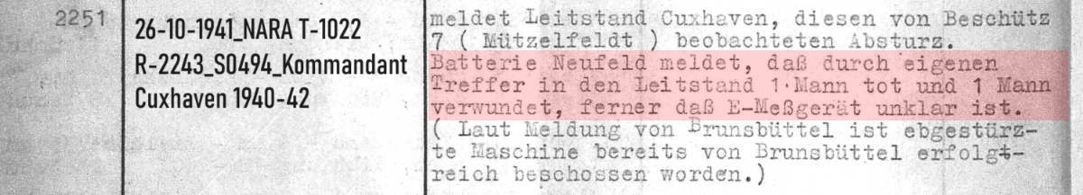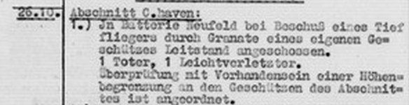 26.10.41- Offensichtlich kam es in der Batterie Schantung-Pollux-Neufeld zum gleichen Unfall, wie auch schon in der Batterie Kugelbake. Während eines flachen Schußes mit der schweren Flak gegen einen Tiefflieger, wurde in diesem Fall der Batterieleitstand getroffen. Hierbei starb ein Soldat, ein weiterer wurde schwer verletzt.