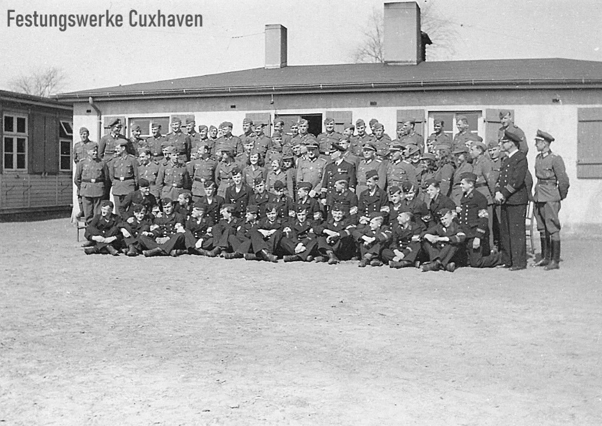 Offiziere vor der Mannschaftsbaracke.