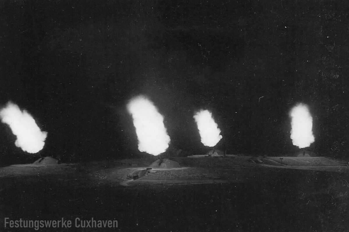 Die vier 10,5 cm Geschütze der Stellung, feuern eine Vollsalve auf anfliegende Bomber.