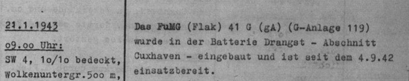 Geschütz 1 der Batterie Drangst in seiner Feuerstellung. Die Aufnahme muss nach Januar 1943 gemacht worden sein, da im Hintergrund bereits das FuMG 41 G aufgebaut ist.