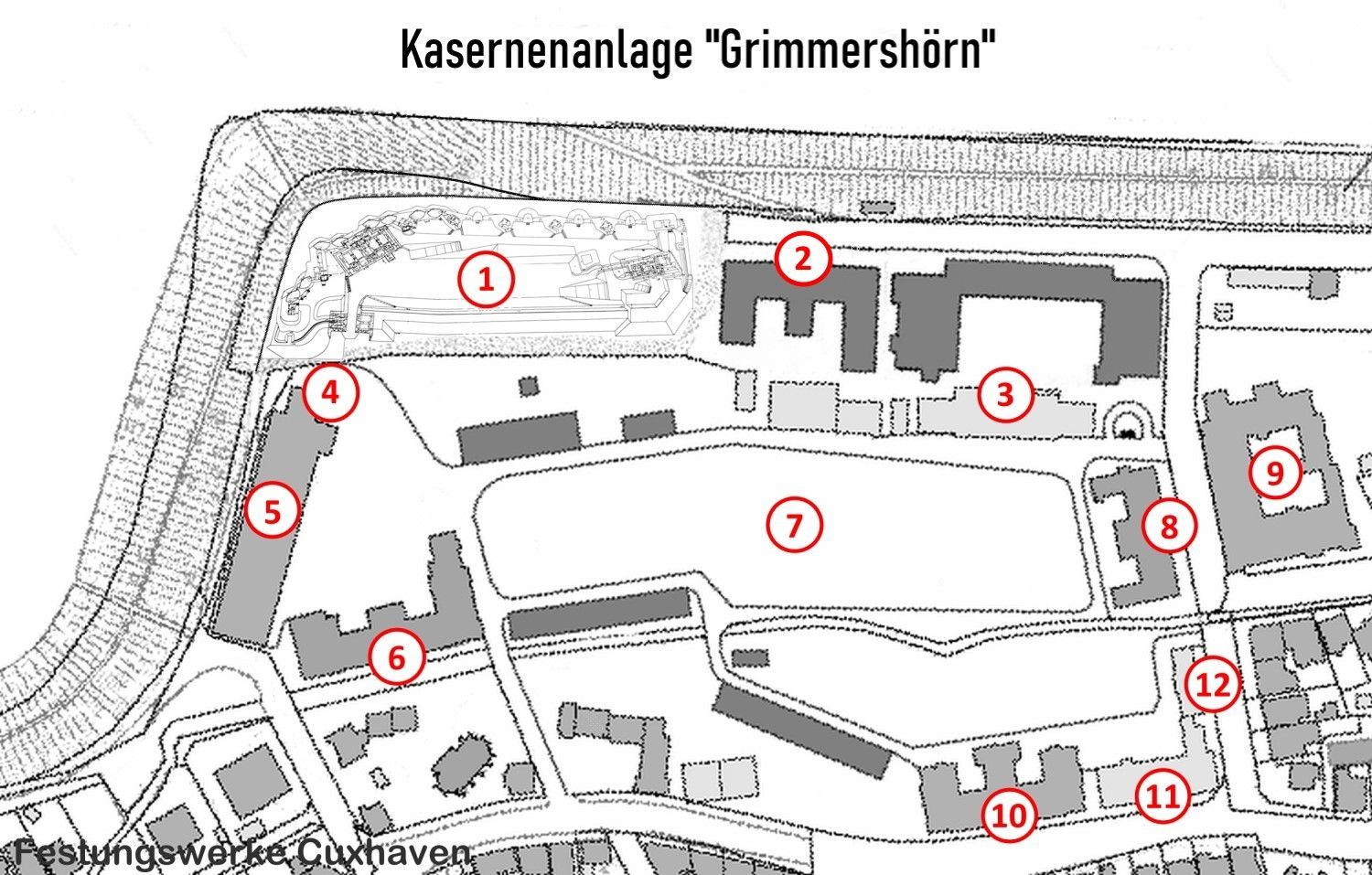 Hinter dem östlichen Deich der Grimmershörnbucht, begannen bereits 1872 zum Schutz der Elbmündung der Bau des gleichnamigen Kanonenforts. Im Rahmen des weiteren Ausbaus des Marinestandortes Cuxhaven, plante man in angrenzender Nähe hierzu den Bau mehrerer Kasernenblöcke und eines Exerzierplatzes. Zuerst erstellt wurde 1892 die aus Holz gefertigte Seedeichkaserne, die in Form eines U gebaut wurde. Laut Entwurfsskizze war es geplant, das sämtliche weiteren Kasernenbauten in der selben Art und Weise gebaut werden sollten. Doch mit der Errichtung der "kleinen Wetternkaserne" 1905 wurde bereits im anderer Stil gebaut, man setzte inzwischen auf die gängigen Werkstoffe Stein und Beton. Nach und nach kamen weitere Kasernenteile hinzu, da der Bedarf zur Ausbildung von Marinestreitkräften stetig anstieg. So entstanden in den nachfolgenden Jahren die "Große Wetternkaserne" und die "Grimmershörnkaserne". Allerdings waren in den verschiedenen Gebäuden neben den neuen Rekruten auch die Stammbesatzungen vor Ort ansässiger Einheiten, wie der 4. Matrosen Artillerie Abteilung kaserniert.