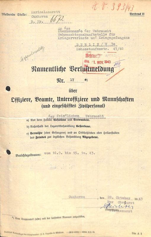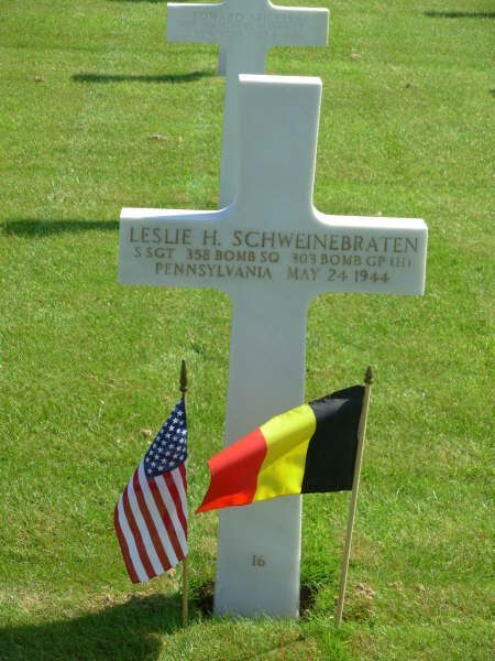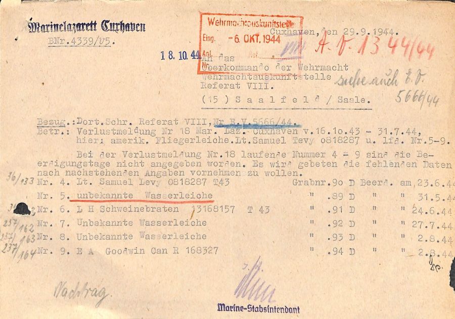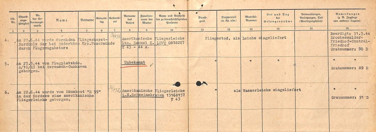 Immer wieder trieben Besatzungsmitglieder abgeschossener Flugzeugbesatzungen an den Küsten der Nordsee an oder wurden durch Fahrzeuge der Kriegsmarine auf See geborgen. Oftmals haben deren sterbliche Überreste bereits längere Zeit im Wasser verbracht, was für die Finder keinen schönen Anblick bot. Nach deren Bergung wurden die Toten zu erst einem Lazarett zugeführt, um die rechtsmäßige Identität zu klären. In den unten beigefügten Dokumenten des Marinelazarett Cuxhaven (Vorgänge von Juni/Juli 1944), befand sich auch Leslie H. Schweinebraten aus Pennsylvania/USA. Er war Seitenschütze an Bord eines amerikanischen Boeing B 17 Bombers (303rd Bomb Group, 358th Bomb Squadron), der etwa 10 Kilometer von Sankt Peter Ording nach Beschuß schwer beschädigt in die See stürzte.