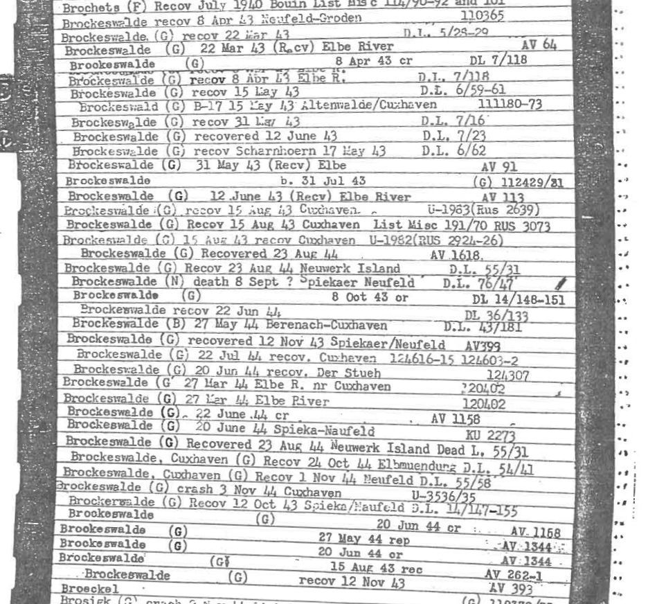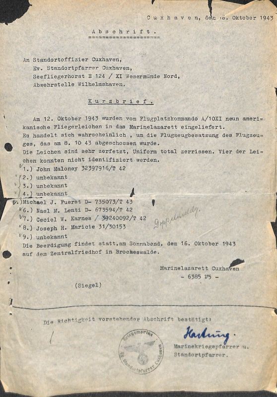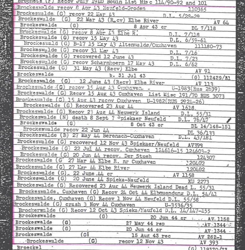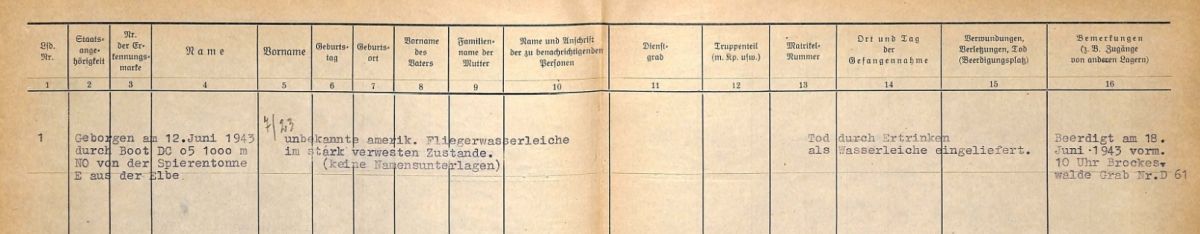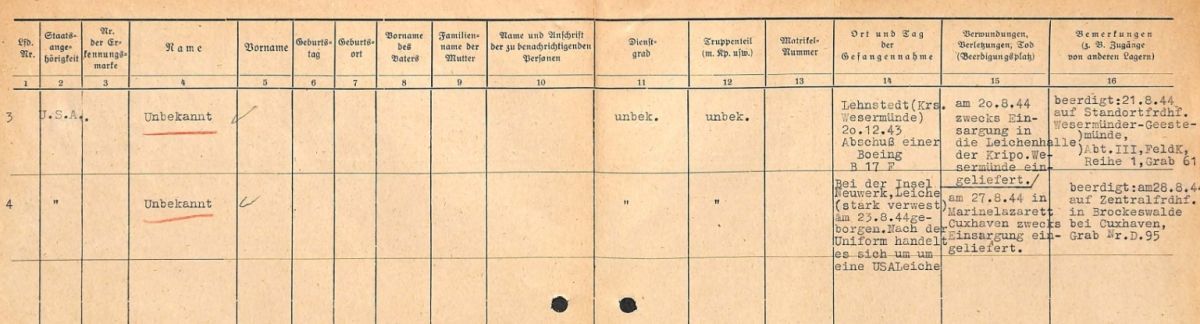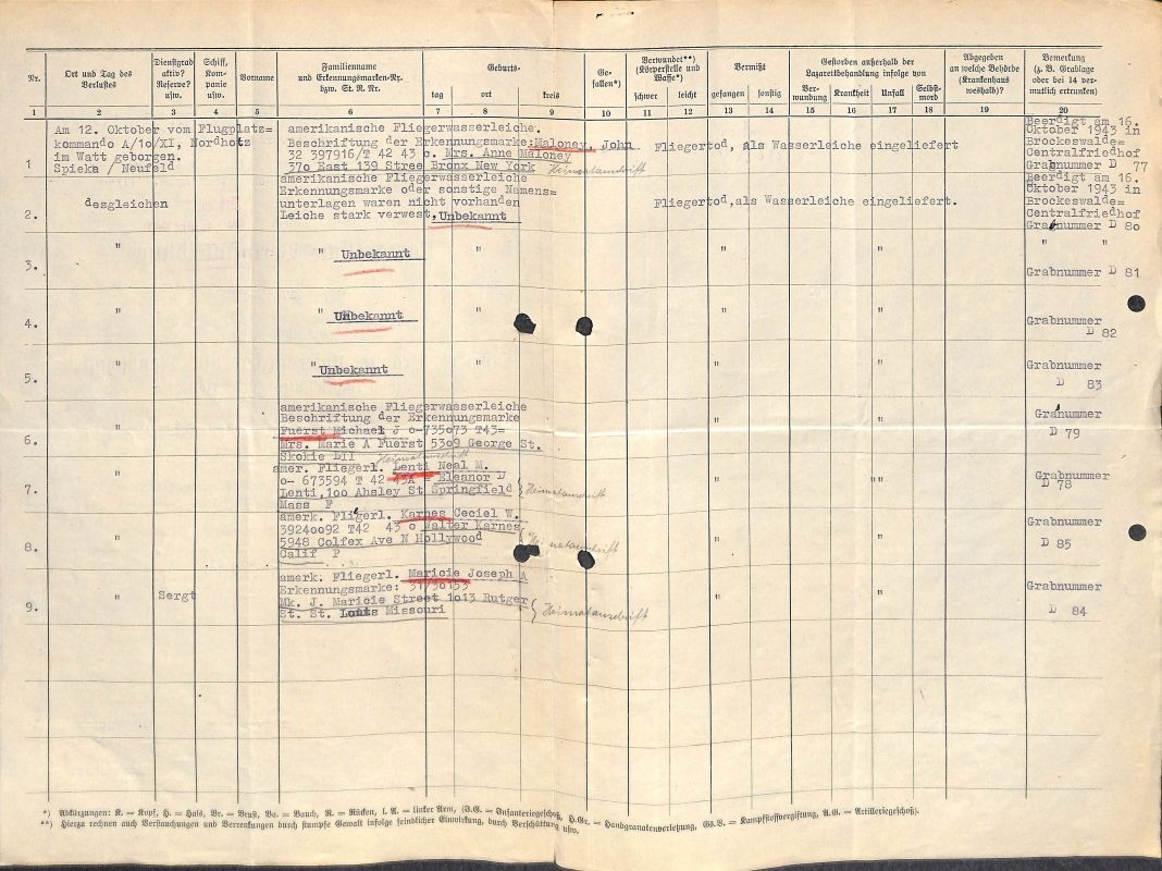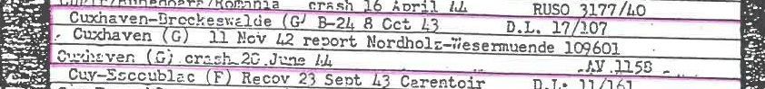 Solche Dokumente (MACR - Missing Air Crew Reports) wie sie oben zu lesen sind, kann man auf der Webseite des amerikanischen Nationalarchivs frei herunterladen. Besatzungen der britischen Luftstreitkräfte und ihrer Verbündeten wurden nach dem Krieg ebenfalls von deutschen Friedhöfen auf entsprechende Ehrenfriedhöfe umgebettet. In Niedersachsen gingen sie hauptsächlich auf den
