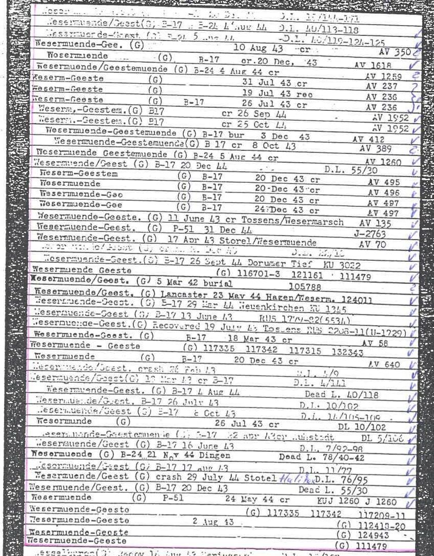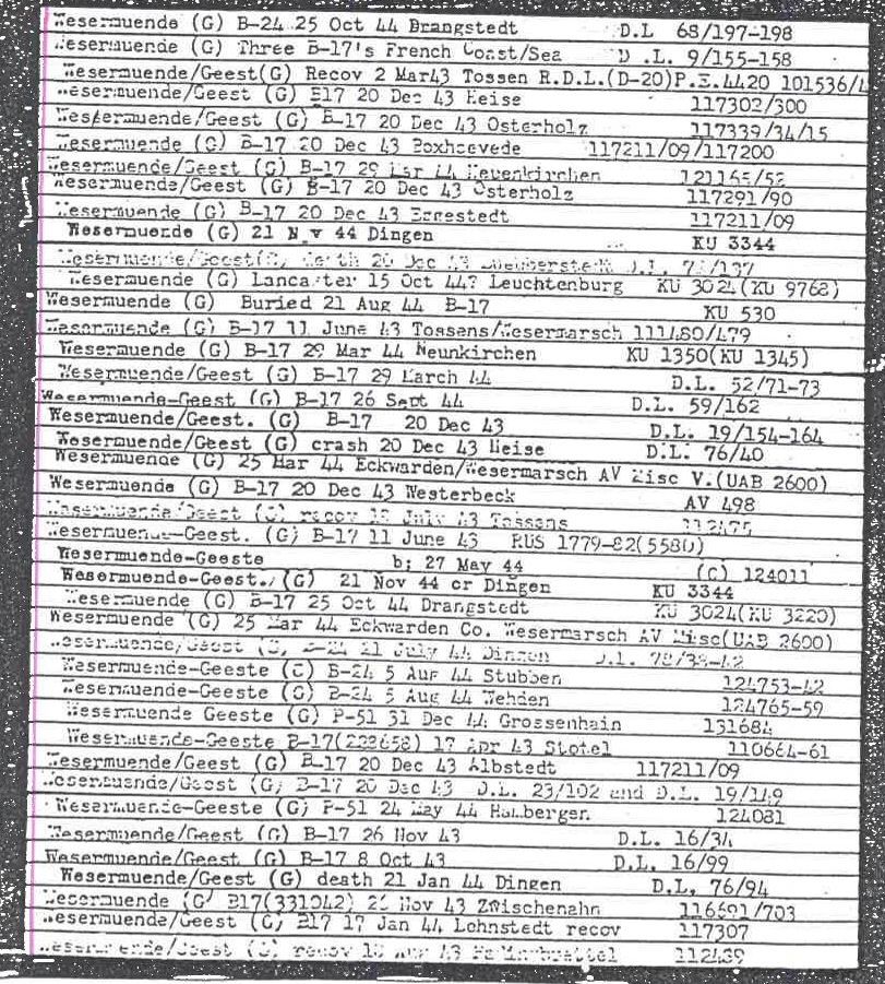 Eine Liste amerikanischer Suchen nach Erstgrablagen gefallener Flugzeugbesatzungen aus den Bereichen Cuxhaven - Wesermünde