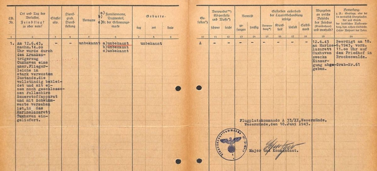 Oftmals trieben tote Flugzeugbesatzungen Tage oder Wochen später an die Küsten oder wurden durch vorbeifahrende Schiffe geborgen. Im Abschnitt Cuxhaven wurden die Leichen dann an das Marinelazarett Cuxhaven übergeben, das eine Untersuchung der Todesursache und eine Ermittlung der Personendaten durchführte, wenn es durch vorhandene Dokumente möglich war. Abschließend wurden die Verstorbenen auf den Zentralfriedhof in Brockeswalde überführt und dort bestattet.