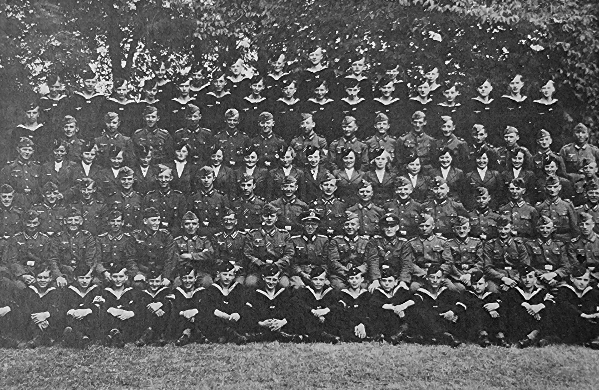 Foto der Batterie Kugelbake von 1945 mit den Geschützführern, den Marinehelferinnen und den Marinehelfern