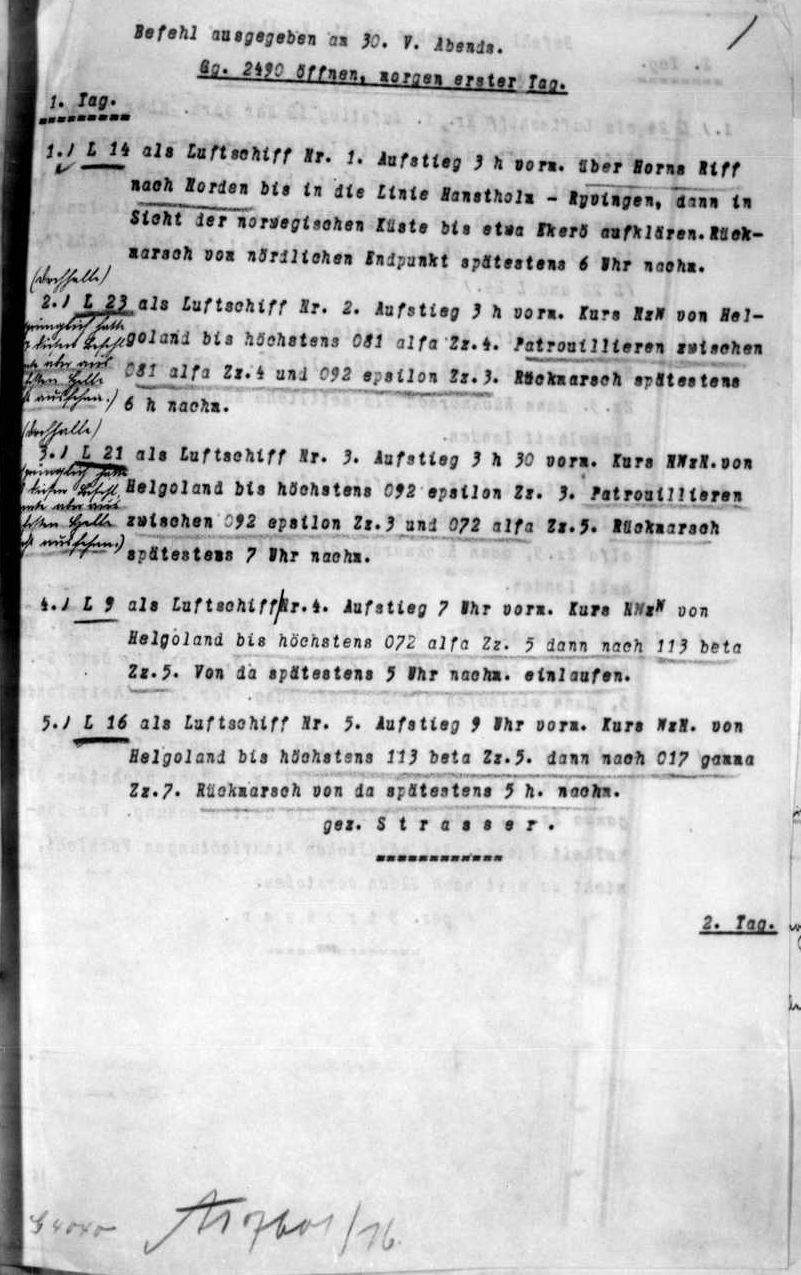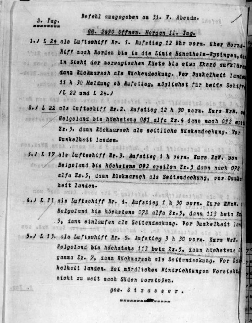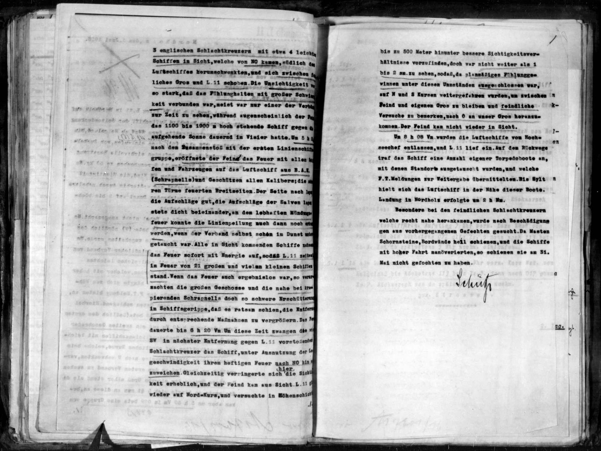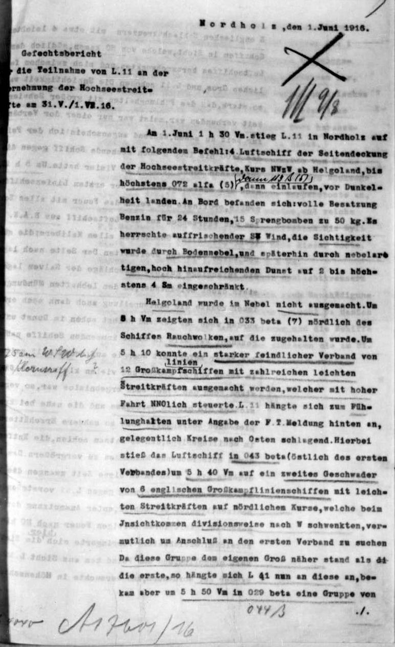 Gefechtsbericht von "L 11" ab dem 31.05.1916 zur Unterstützung während eines größeren Unternehmens der Hochseeflotte auf der Nordsee. "L 11" gehörte dabei zu einer Gruppe mehrerer Luftschiffe die diesen Einsatz unterstützten. Der führende Offizier der fliegenden Einheiten war in diesem Fall Peter Strasser.