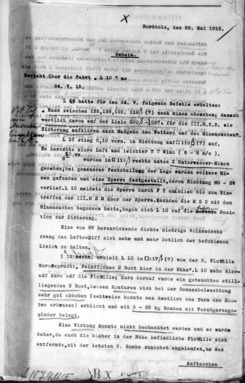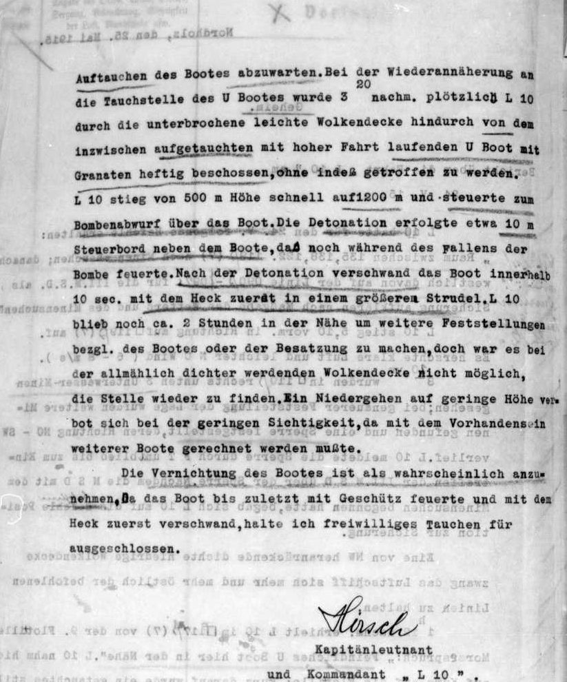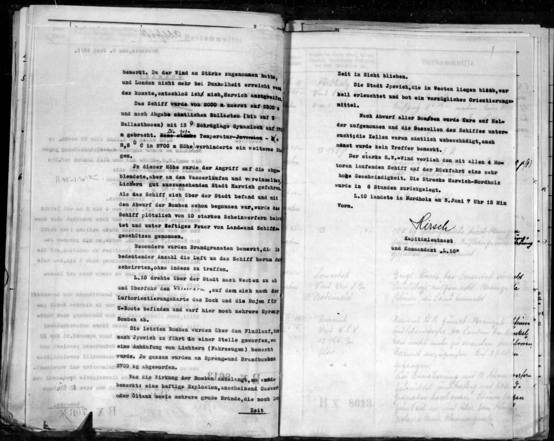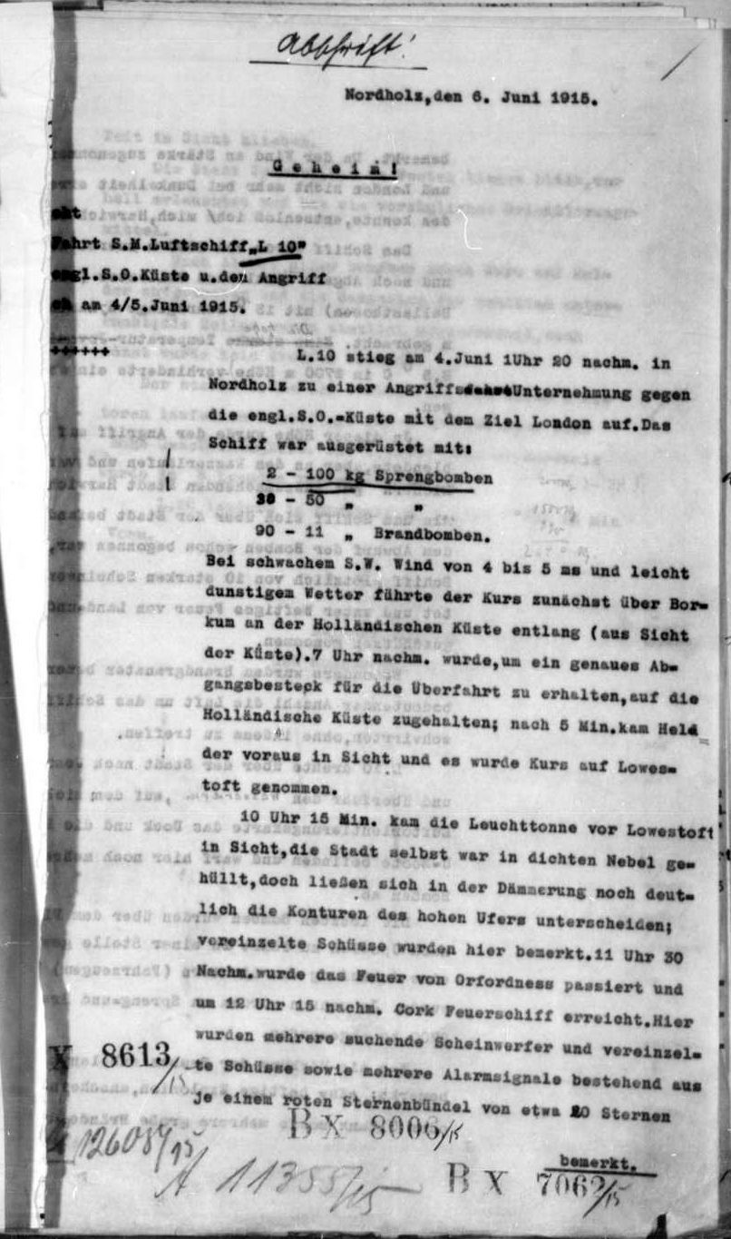 Gefechtsbericht von "L 11" ab dem 31.05.1916 zur Unterstützung während eines größeren Unternehmens der Hochseeflotte auf der Nordsee. "L 11" gehörte dabei zu einer Gruppe mehrerer Luftschiffe die diesen Einsatz unterstützten. Der führende Offizier der fliegenden Einheiten war in diesem Fall Peter Strasser.