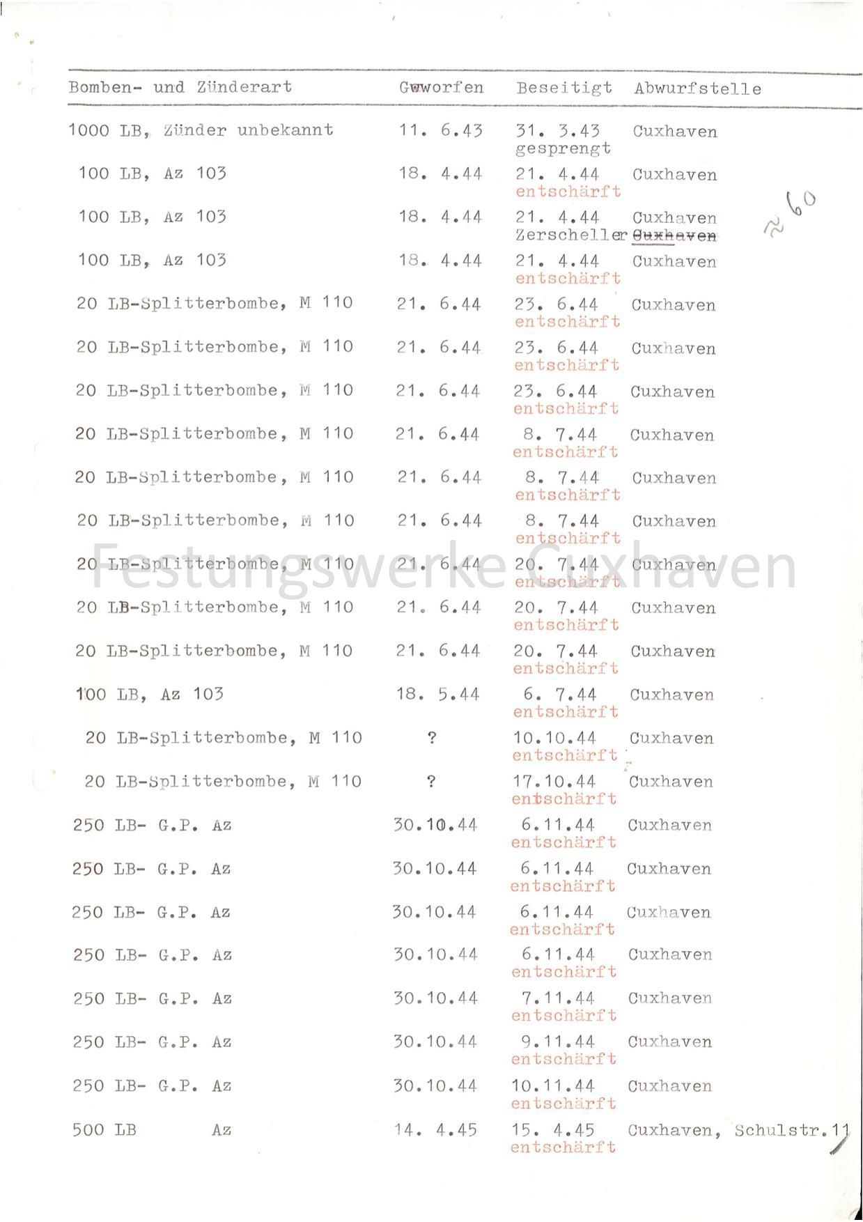 Bis Kriegsende Mai 1945 wurden durch die Alliierten fast 2000 Sprengkörper verschiedenster Art auf Cuxhaven abgeworfen. Hierbei waren im Schnitt 20 % der Bomben Blindgänger die nicht explodierten, das wären rechnerisch 400 Stück. Etwas weniger als die Hälfte wurden in und nach dem Krieg durch Räumkräfte entschärft. Positiv dabei ist die Menge der in die Elbe gegangenen Blindgänger. Trotz den Sondierungen werden hier sicherlich noch einige unangenehme Überaschungen im Boden unser Stadt schlummern, die niemand auf dem Zettel hat.