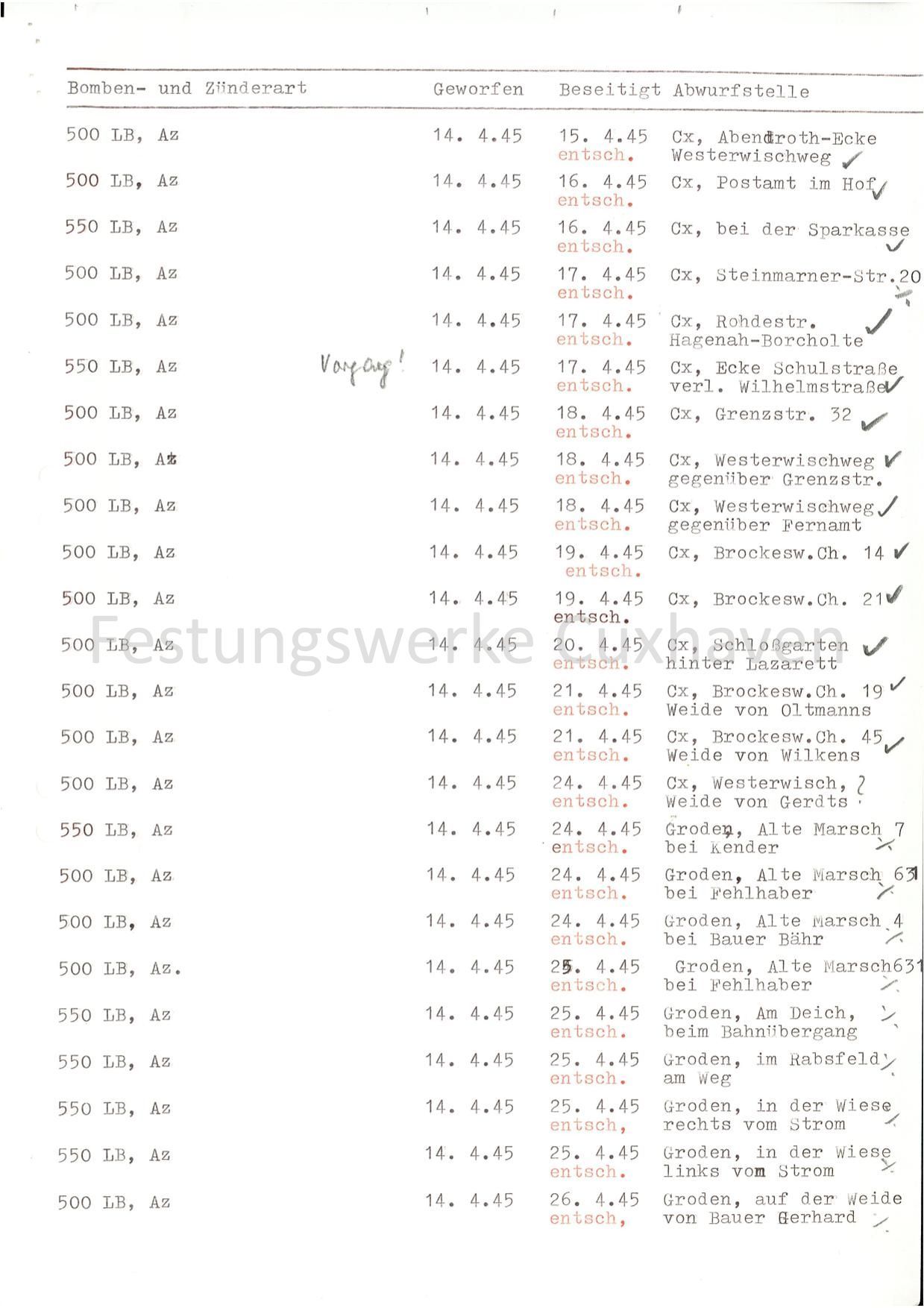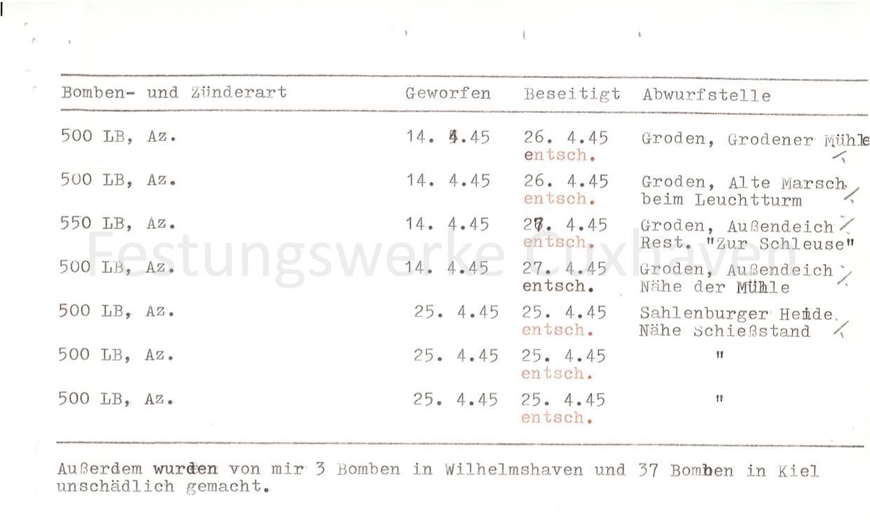 Eine Liste von Entschärfungen und Sprengungen von Blindgängern im Elbe - Weser Raum 1940/41 durch das Räumkommando Cuxhaven.