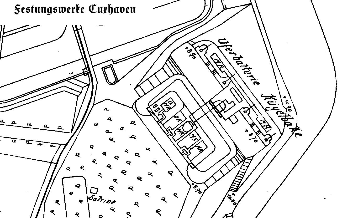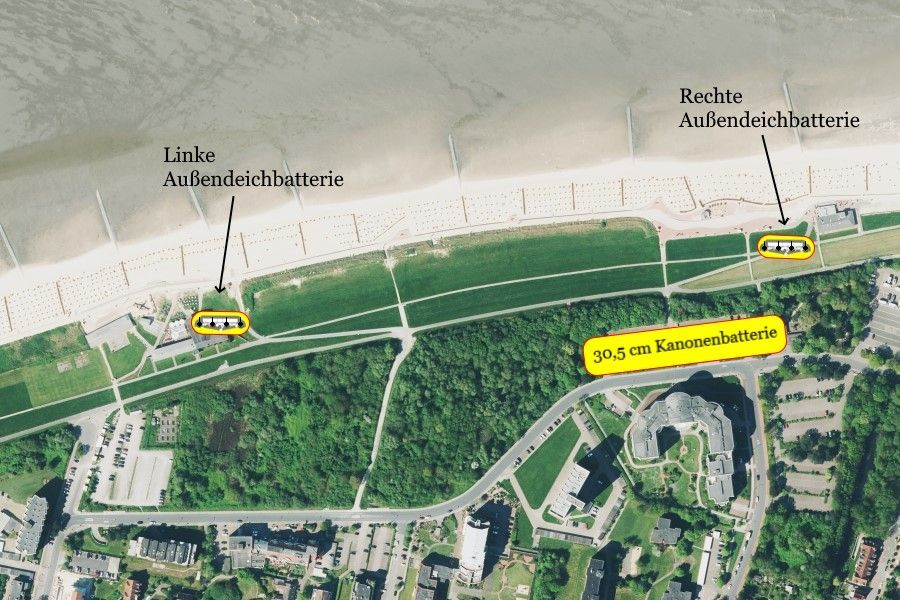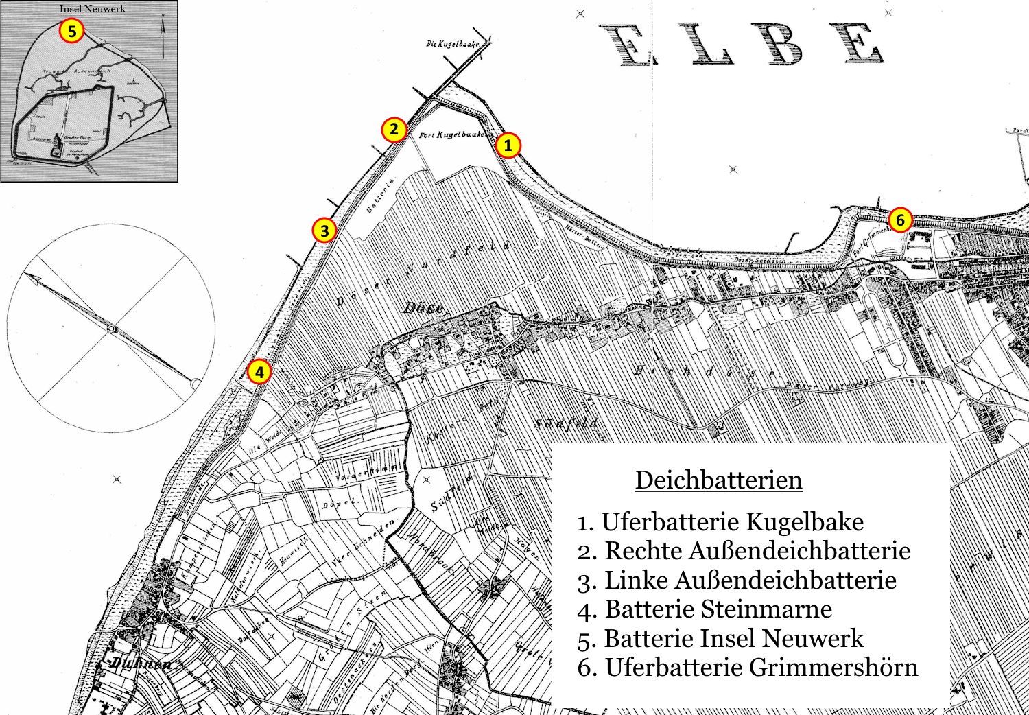 Uferbatterie Kugelbake in der Vergrößerung. Allerdings war die Batterie mit 4 Geschützen ausgestattet und nicht wie auf dem Auschnitt dargestellt nur mit Zweien.