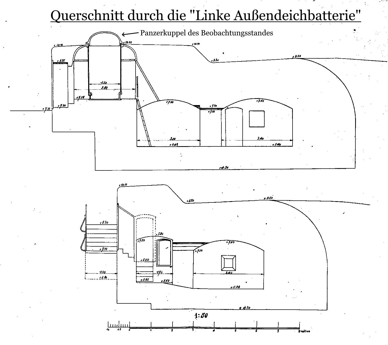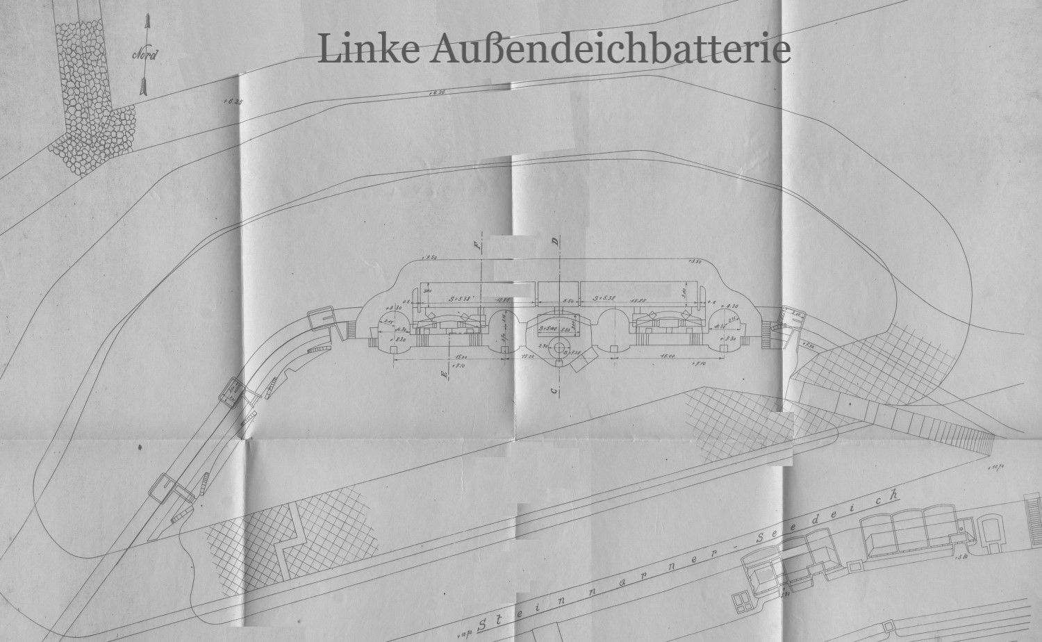 Rechten Außendeichbatterie. Sie wurde auf der linken Seite mit einer Infanteriebrüstung gebaut, deren Richtung in einen Winkel von etwa 120° zum Deich nach Osten lag.