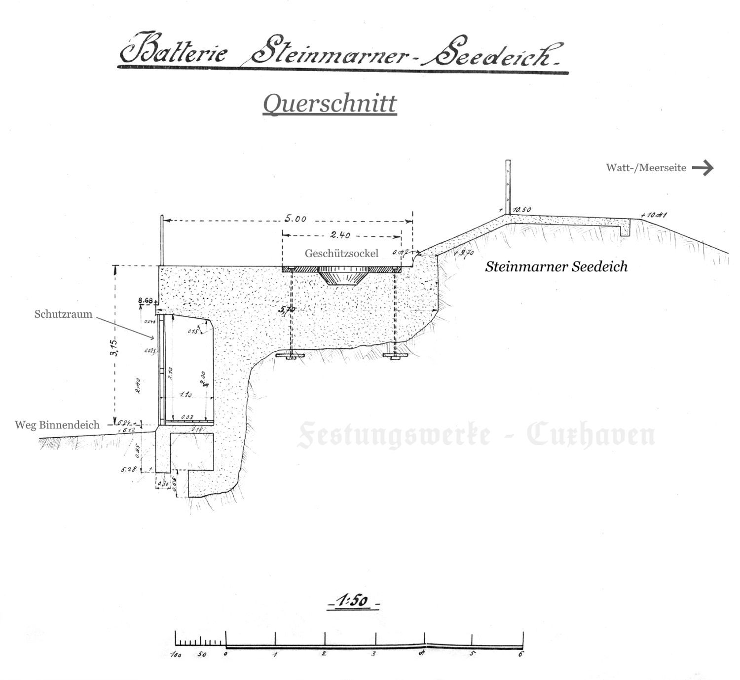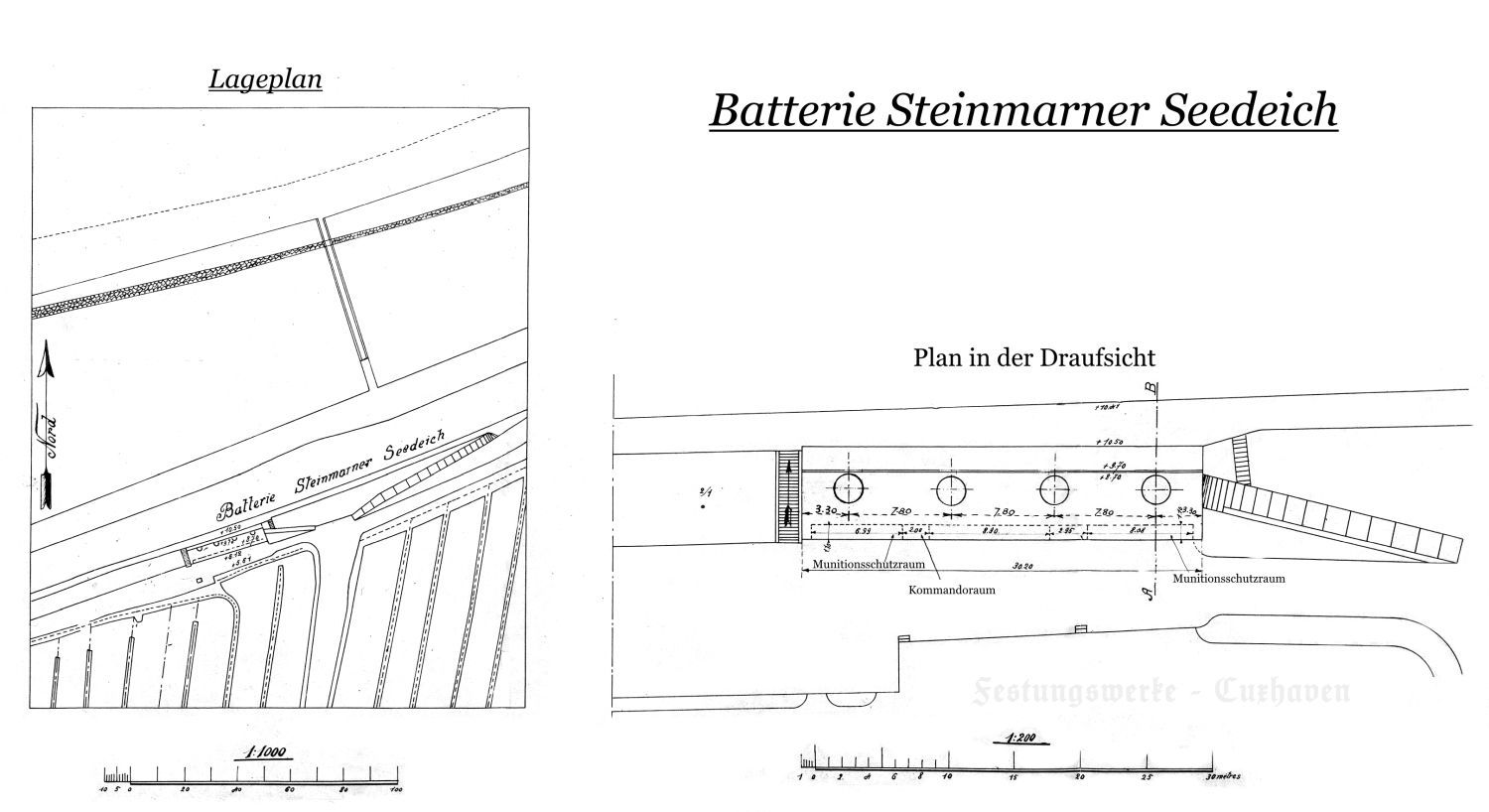 Bei der Stellung handelte es sich um eine Freiluftbatterie, die in den Kriegsjahren 1914/15 erbaut wurde und nach Norden hin ausgerichtet war. Ihr Standort befand sich etwa 700 Meter westlich der Kanonenbatterie - Döse. Sie war geradlinig auf einer Länge von 37 Metern in den Steinmarner Seedeich gebaut, der auch als Teil der Brüstung genutzt wurde. Hierbei ragte der Deichkörper etwa einen Meter über den Fundamentsockel der Geschütze, die Deichhöhe betrug an dieser Stelle acht Meter.