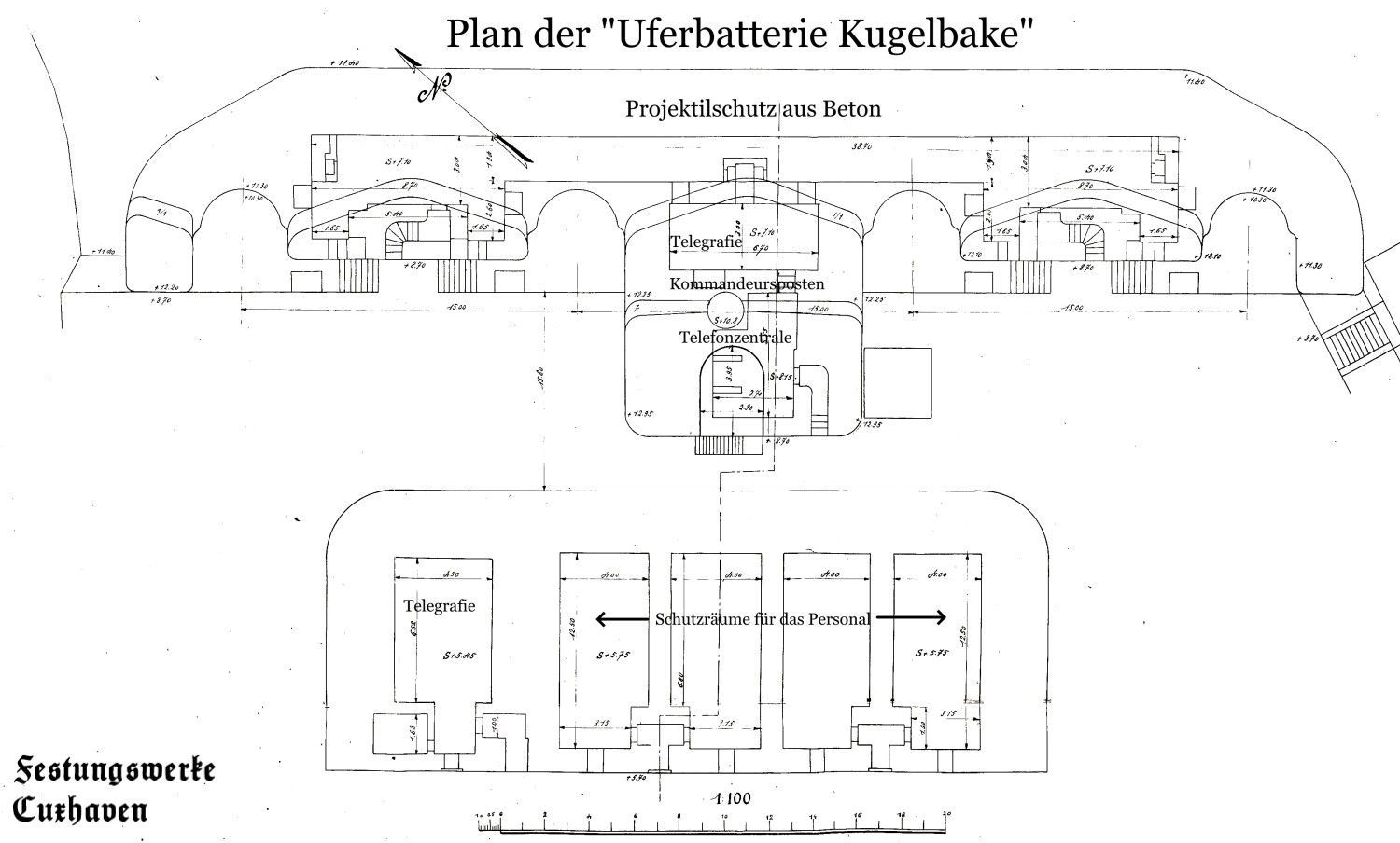 Der Quergang in der vordere Kasematte verband die Mannschaftsräume 1 - 4 und ermöglichte den Zugang zu den Artilleriemagazinen (Geschossräume), die sich unter der Brüstung befanden. Der mittlere Teil bildete den Komandeurstand und lag etwas hinter den bereits erwähnten offenen Geschützstellungen. Dort befand sich auch die Telefon- und Telegrafieabteilung der Batterie. Die Uferbatterie - Kugelbake verfügte weder über eine eigene Stromversorgung, auch gab es keinen Suchscheinwerfer. Strom und Trinkwasser wurden durch das öffentliche Netzsystem sichergestellt.