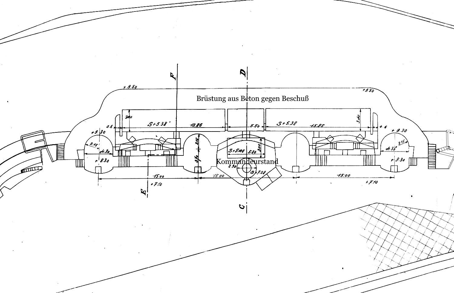 Auch war die Frontbrüstung geradlinig aus drei Meter dickem Beton gegossen und ragte vier Meter in die Höhe, geschützt wurde sie zusätzlich durch eine breite Erdaufschüttung. Ebenfalls gab es mittig den zentralen Kommandeurstand mit aufgesetztem, gepanzerten Beobachtungsposten.