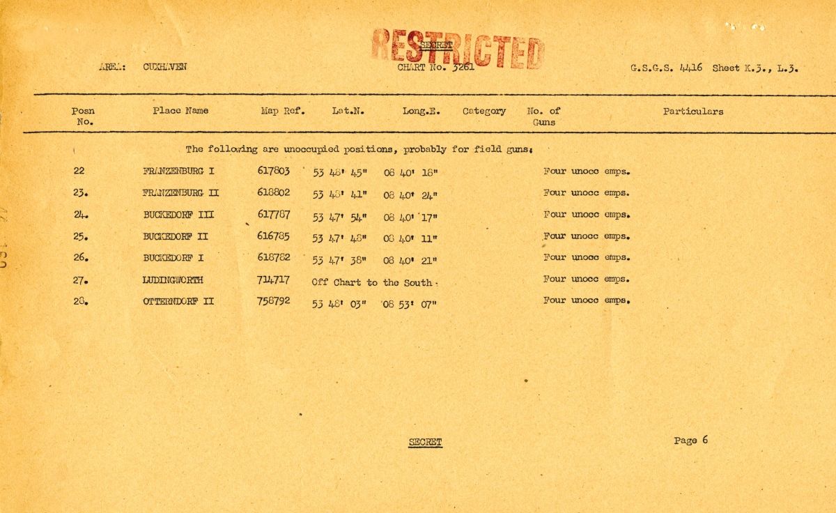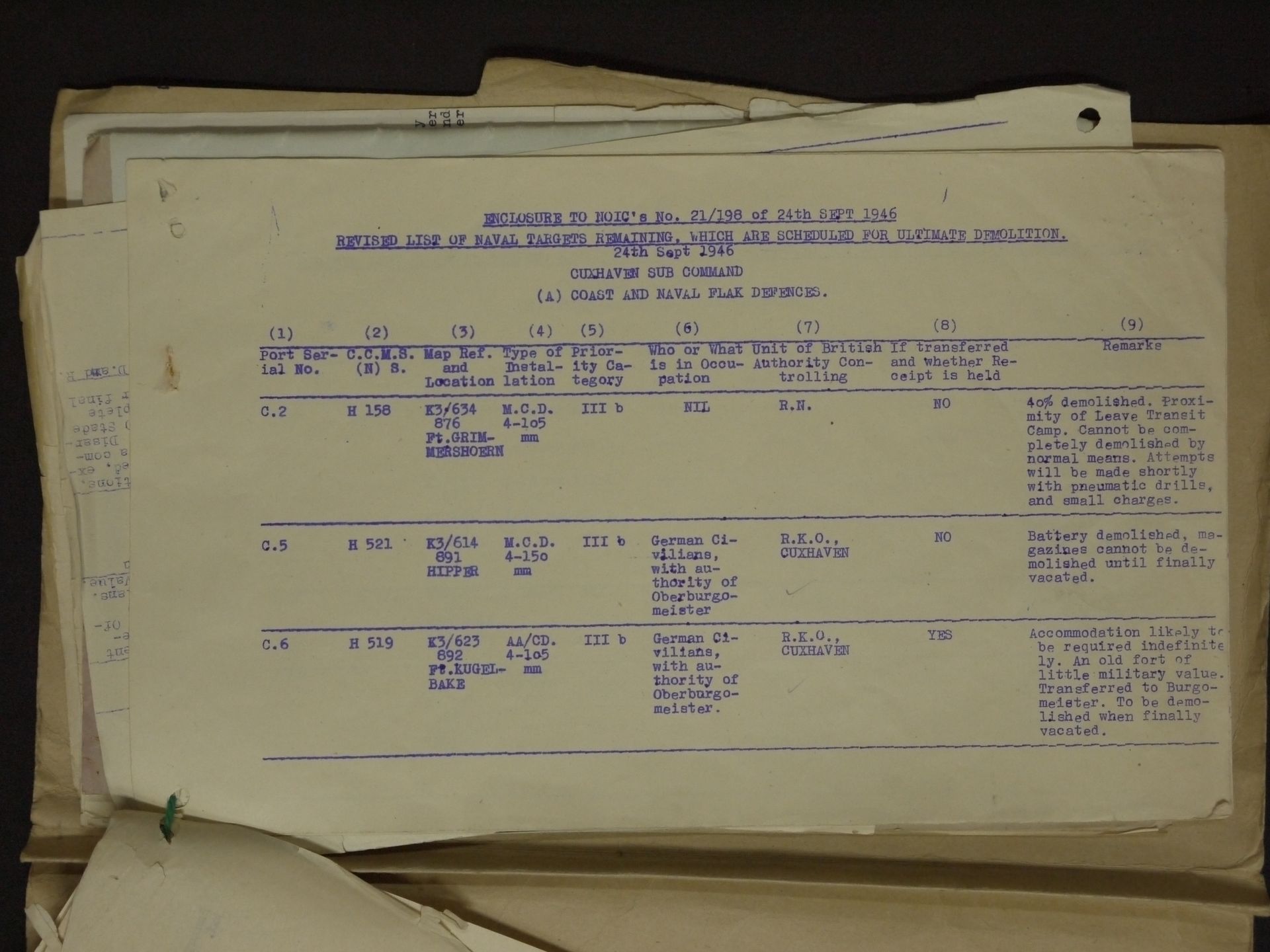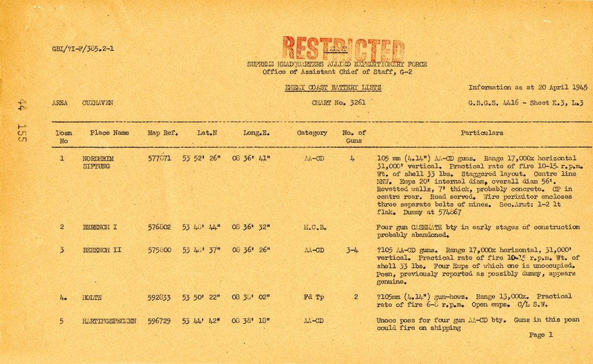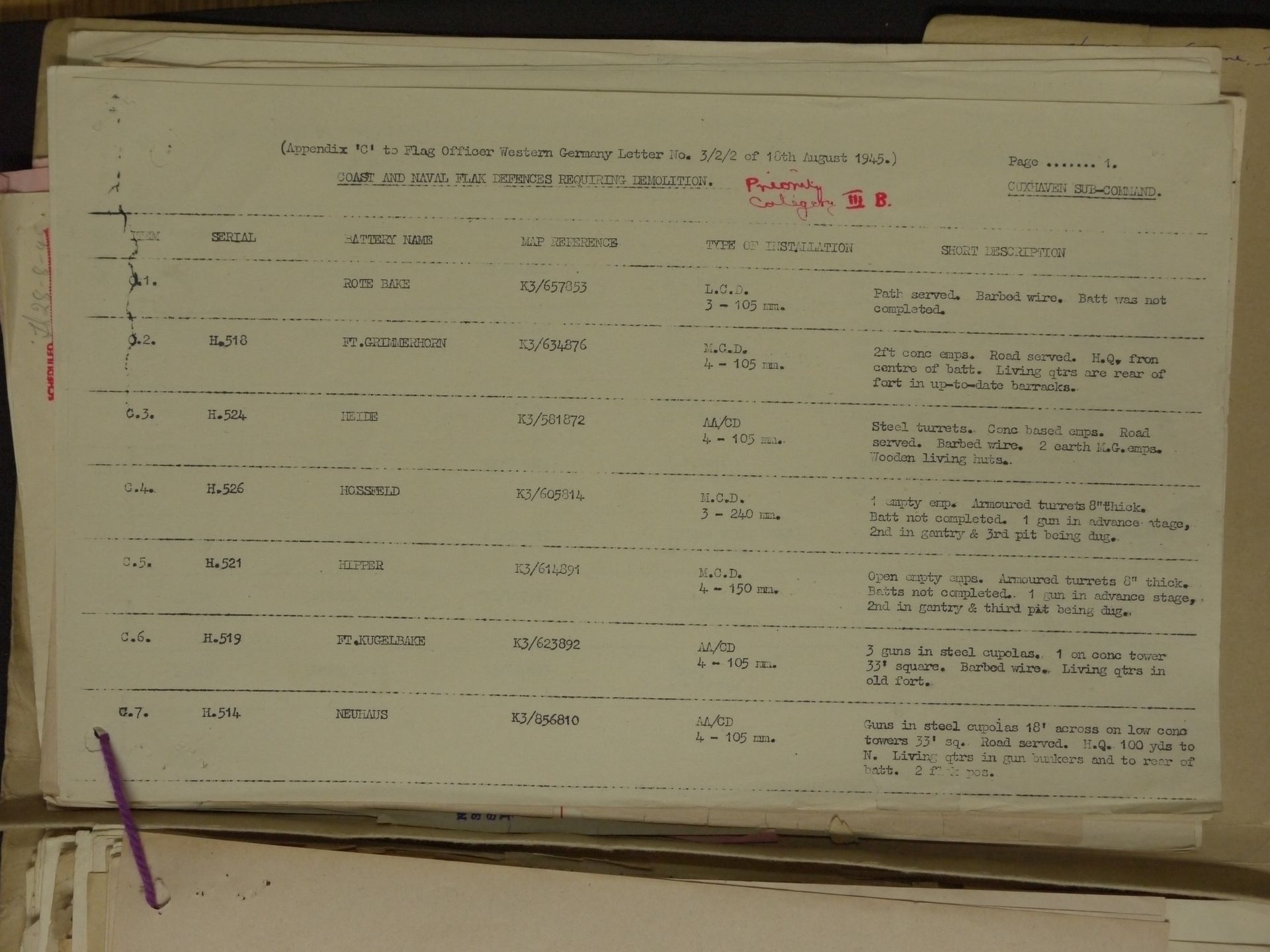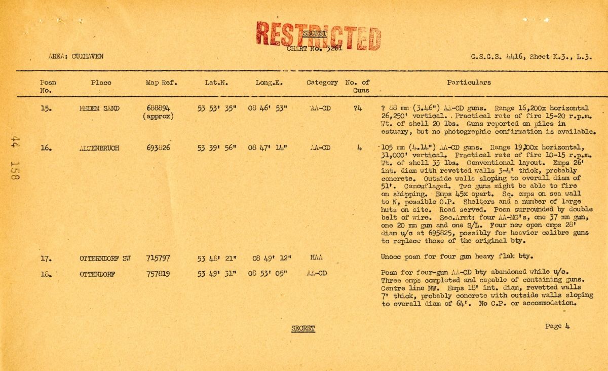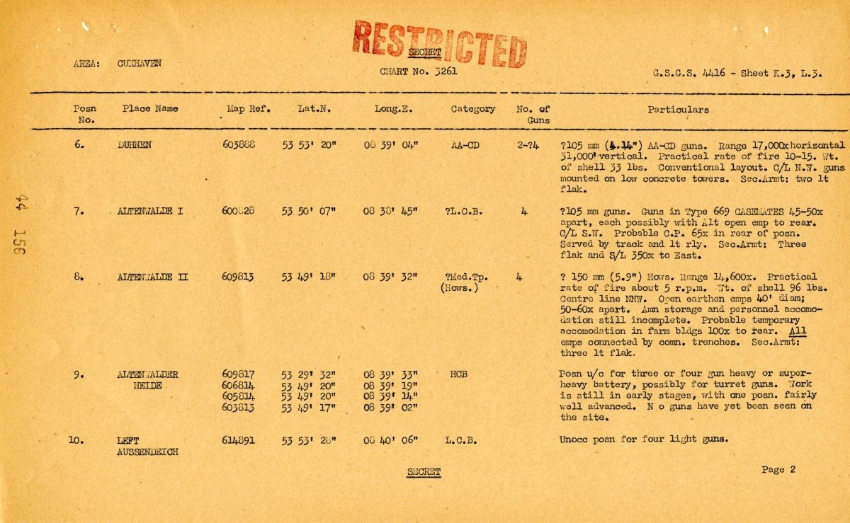 Geheimpläne der Alliierten über die Standorte der militärischen Anlagen im Bezirk Cuxhaven vom 20. April 1945. Da dieses Datum noch vor Kriegsende ist, lässt die Vermutung aufkommen, das sich diese Informationen auf erbeutete deutsche Geheimpläne und entsprechende Luftaufklärung stützen.