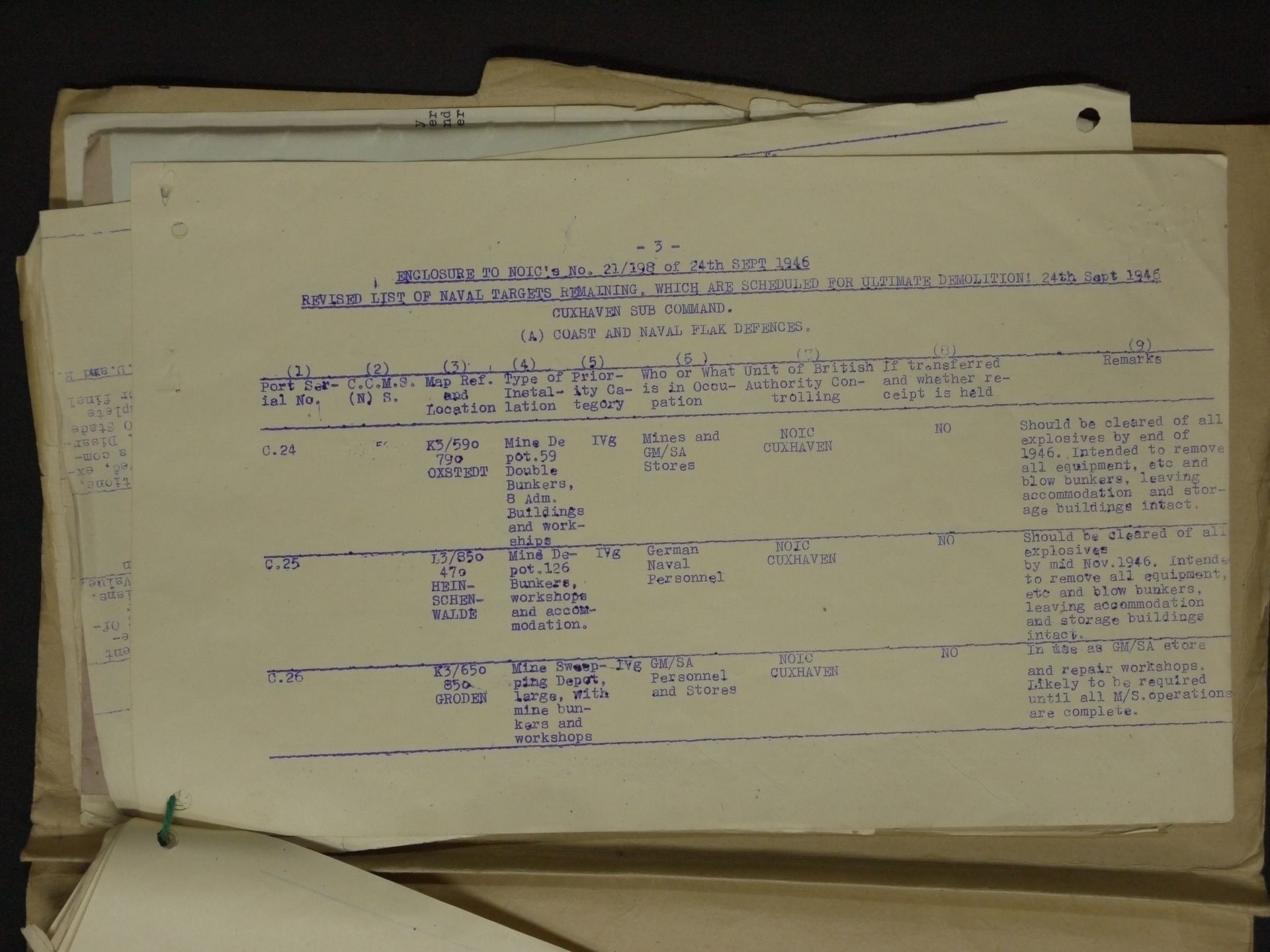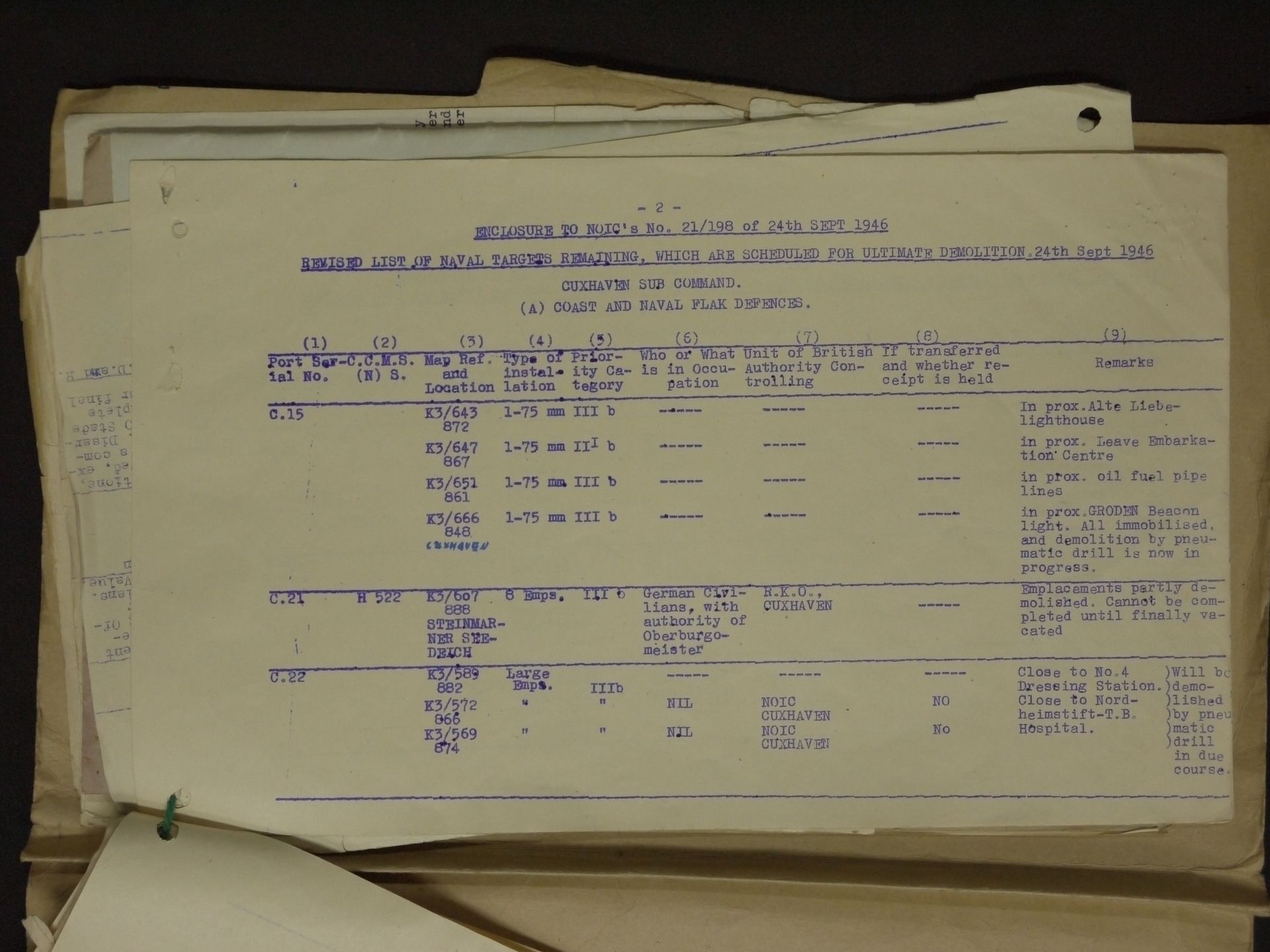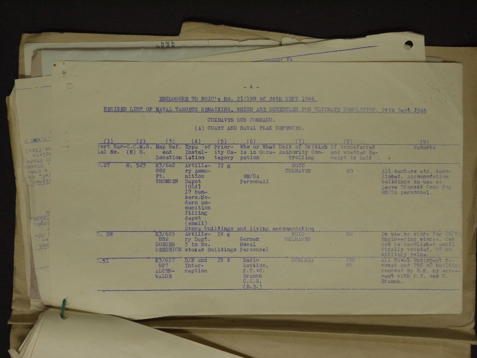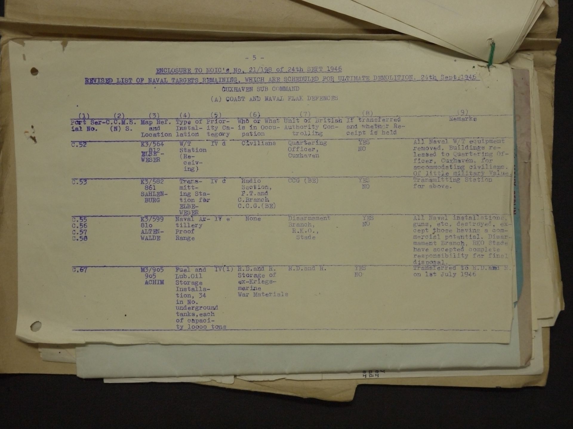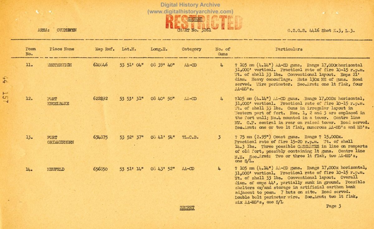 Geheimpläne der Alliierten über die Standorte der militärischen Anlagen im Bezirk Cuxhaven vom 20. April 1945. Da dieses Datum noch vor Kriegsende ist, lässt die Vermutung aufkommen, das sich diese Informationen auf erbeutete deutsche Geheimpläne und entsprechende Luftaufklärung stützen.