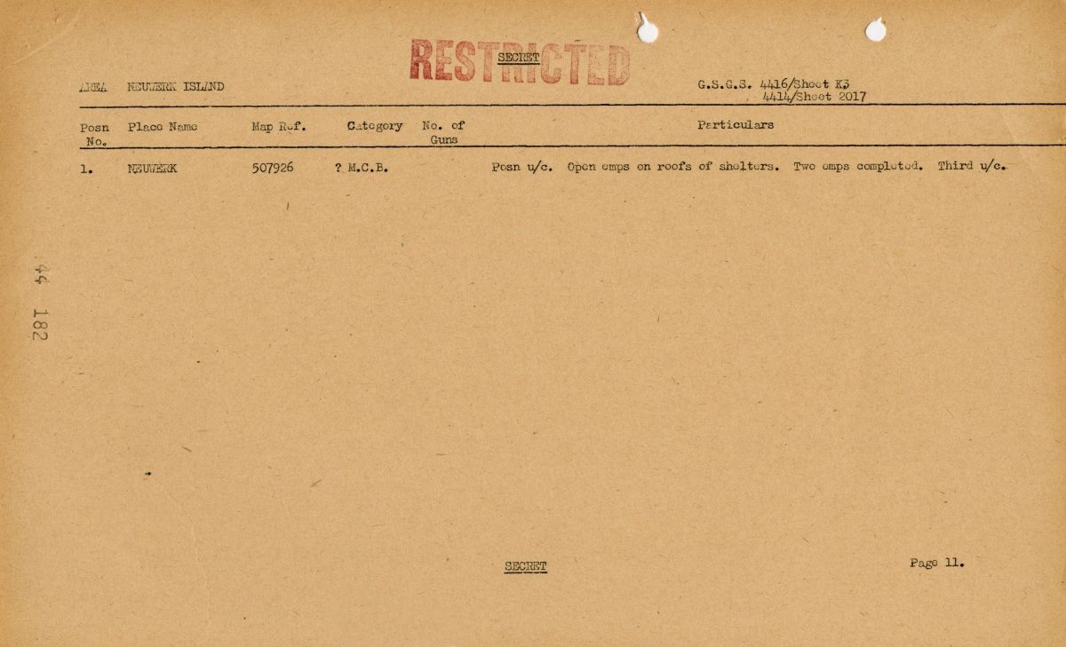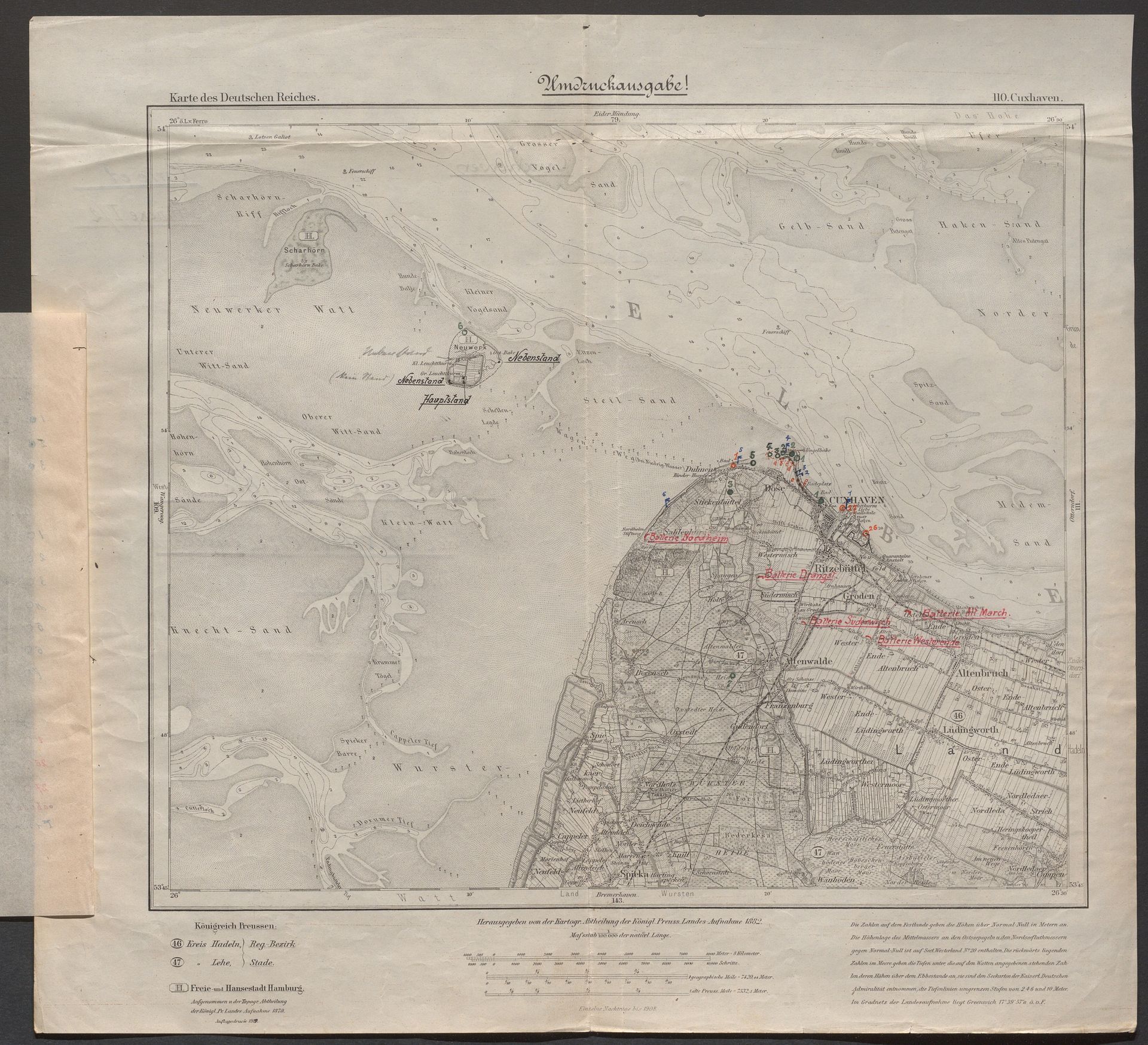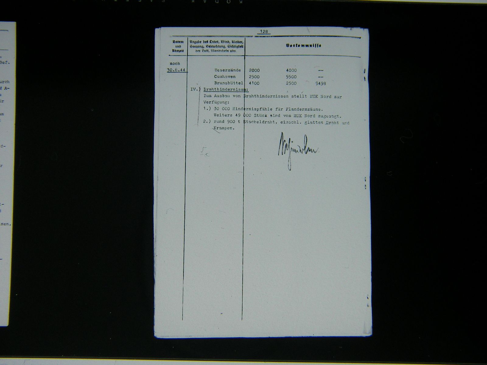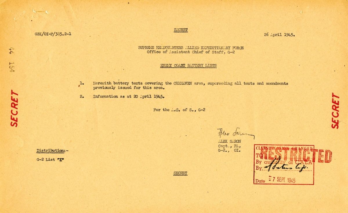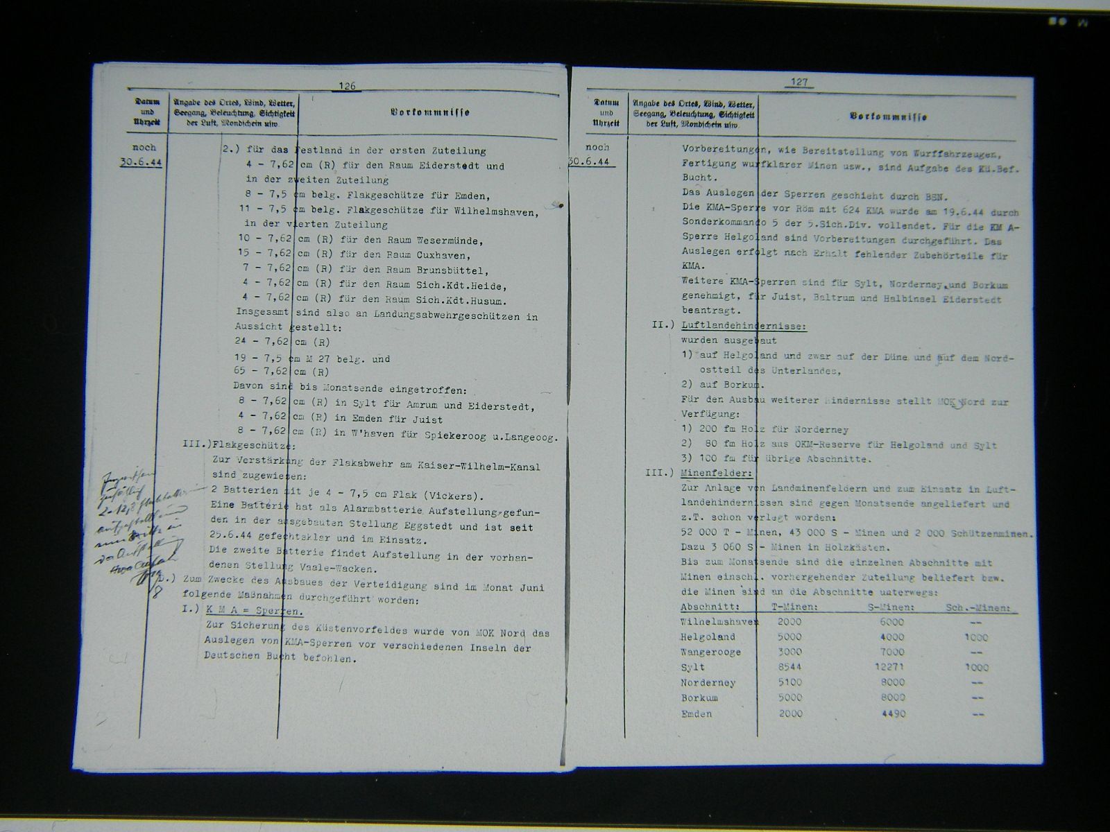 Geheimpläne der Alliierten über die Standorte der militärischen Anlagen im Bezirk Cuxhaven vom 20. April 1945. Da dieses Datum noch vor Kriegsende ist, lässt die Vermutung aufkommen, das sich diese Informationen auf erbeutete deutsche Geheimpläne und entsprechende Luftaufklärung stützen.