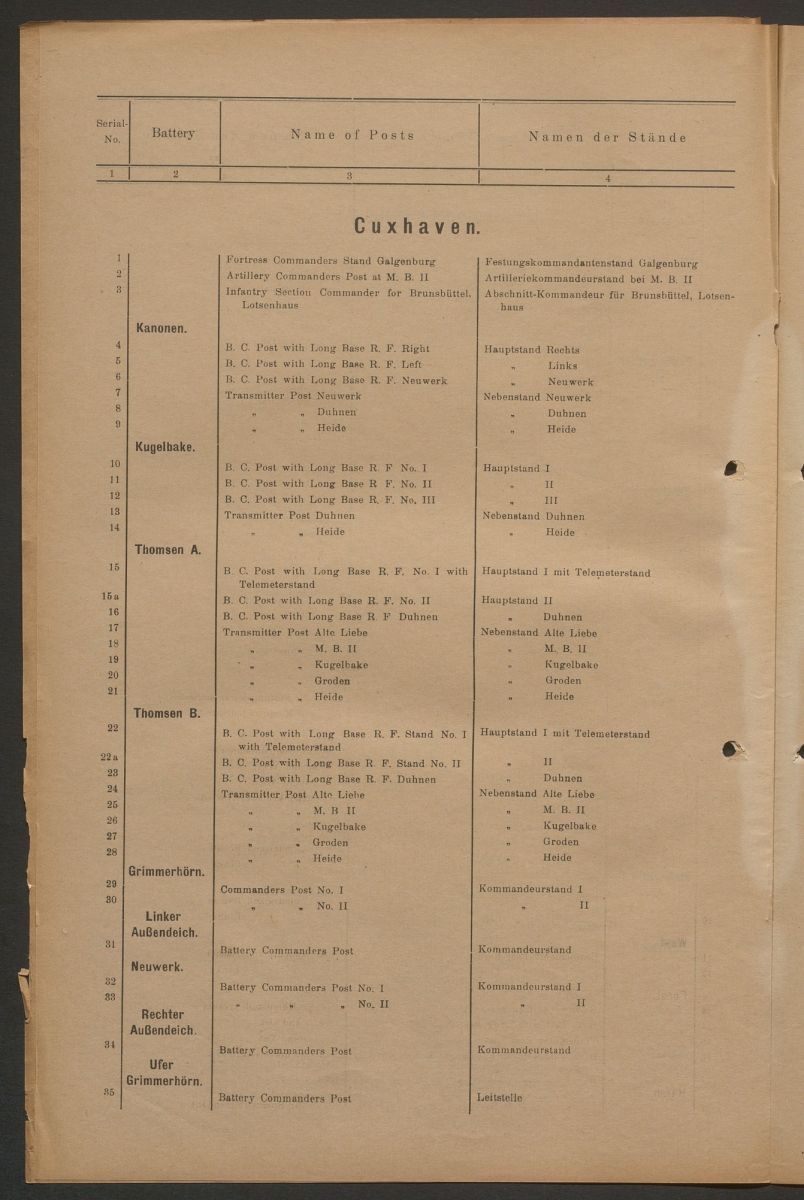 Darunter waren das Fort Kugelbake, Fort Thomsen, Fort Grimmershörn, Grodener Schanze. Batterie Steinmarner Seedeich, Uferbatterie Kugelbake, Linke Aussendeichbatterie, Rechte Aussendeichbatterie, Kanonenbatterie (Döse), Mörserbatterie (Döse), Batterie Alte Liebe, und die Molenbatterie.