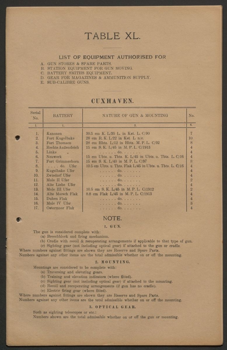 AA/CD = Schwere Marineflakbatterie, H.A.A. = Schwere Flakbatterie, M.C.B. = Mittlere Küstenbatterie (Artillerie), L.C.B = Leichte Küstenbatterie (Artillerie), H.C.B = Schwere Küstenbatterie (Artillerie), FdTp. = Feldkanonenstellung, TiedTP /Hows = Schwere Mörserbatterie.