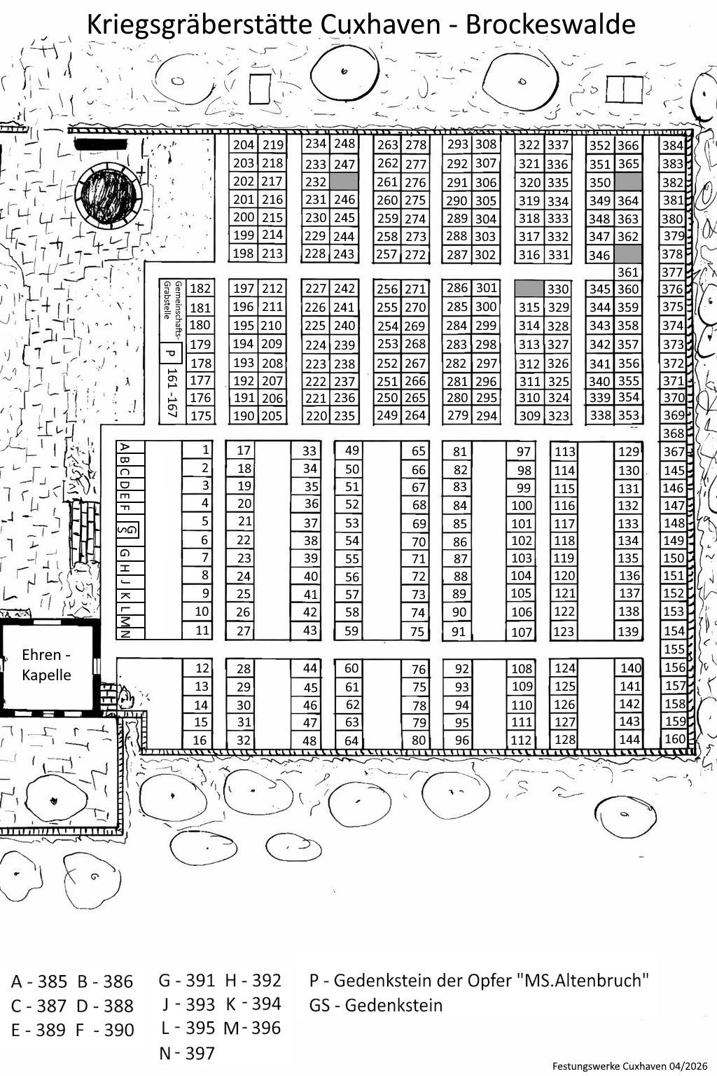 Die örtliche Kriegsgräberstätte befindet sich unmittelbar hinter der Trauerhalle des Zentralfriedhofs Cuxhaven-Brockeswalde. Im westlichen Teil des Geländes erstreckt sich das Ehrenfeld für die Gefallenen des Zweiten Weltkriegs. Hier ruhen Angehörige aller drei Teilstreitkräfte der Wehrmacht, die zivilen Opfer der Luftangriffe auf Cuxhaven und der ums Leben gekommenen Mitglieder der GMSA. Während viele Marinesoldaten bei Kampfhandlungen zwischen See- und Luftstreitkräften oder während der Seeminenräumtätigkeiten ihr Leben verloren, starben andere Personen infolge von Krankheiten oder Unfällen. Über die Kriegsjahre hinaus umfasst die Stätte zudem die Opfer der „Lichtwark“-Katastrophe. Bei diesem Schiffsuntergang auf der Unterelbe am 24.02.1946, kamen mehr als 100 Militärangehörige der Deutschen Minenräumverwaltung (GMSA) während eines schweren Sturmes vor der Ostemündung ums Leben.