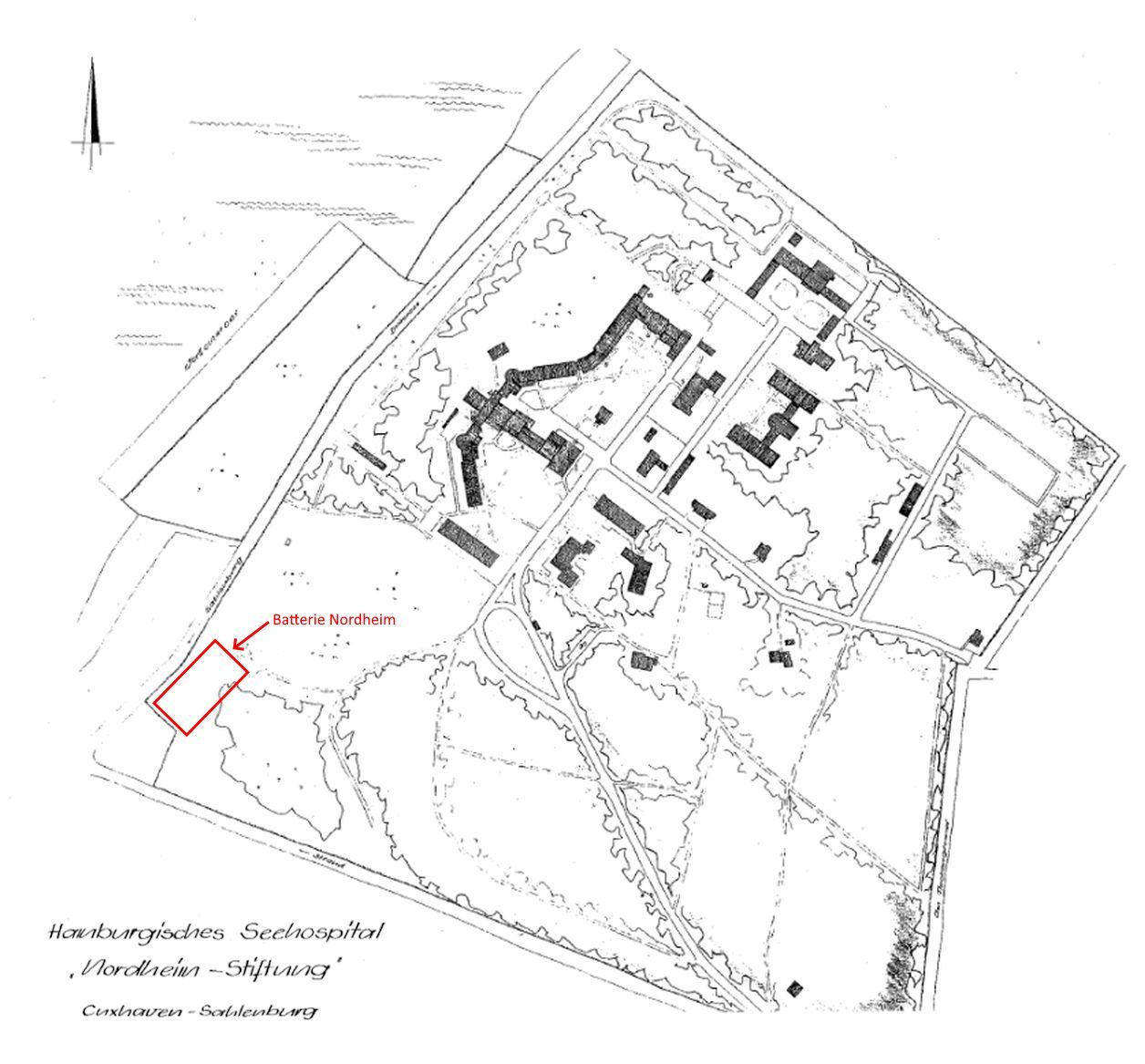 When the First World War began, the military moved into the Nordheim Foundation's premises and hospital operations had to be stopped. A battery was built on the site that was needed for coastal defense. This was the Nordheim anti-aircraft position on the southwest side of the site. For this purpose, several of the hospital buildings were confiscated for use by the Reichswehr, primarily to house soldiers. After the end of the First World War and the withdrawal of the military, the institution went back into operation under the direction of Hamburg despite difficult economic circumstances.