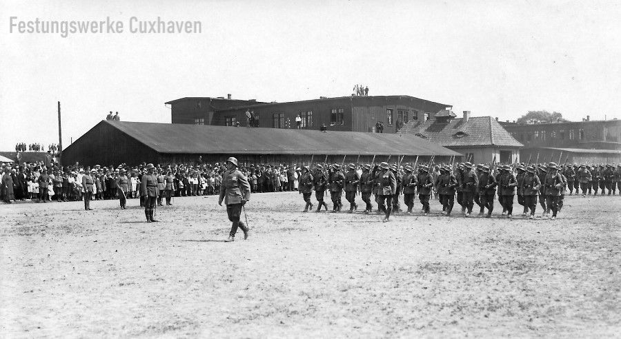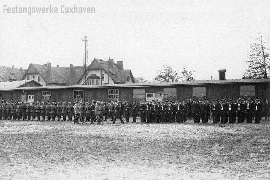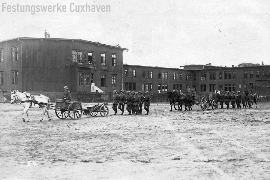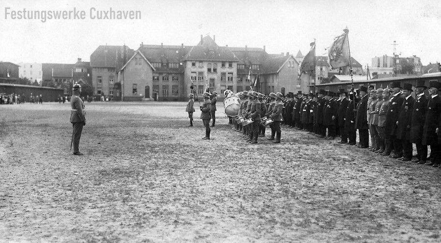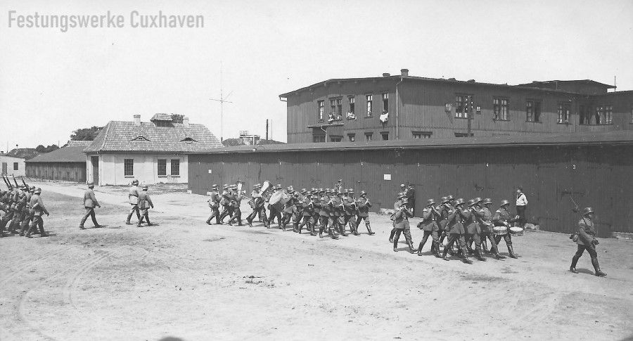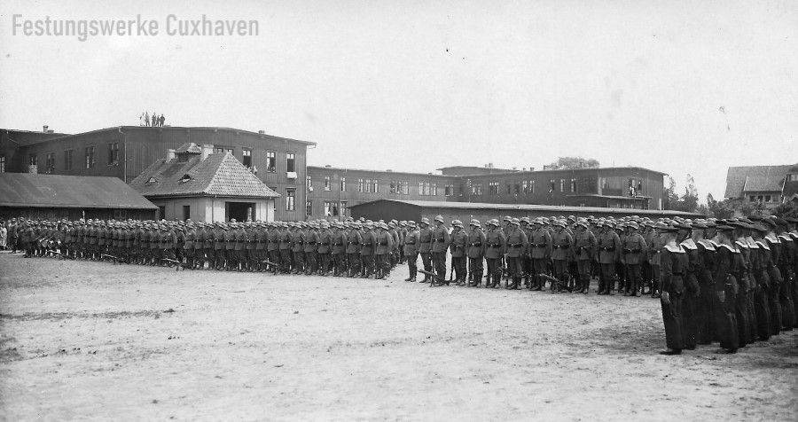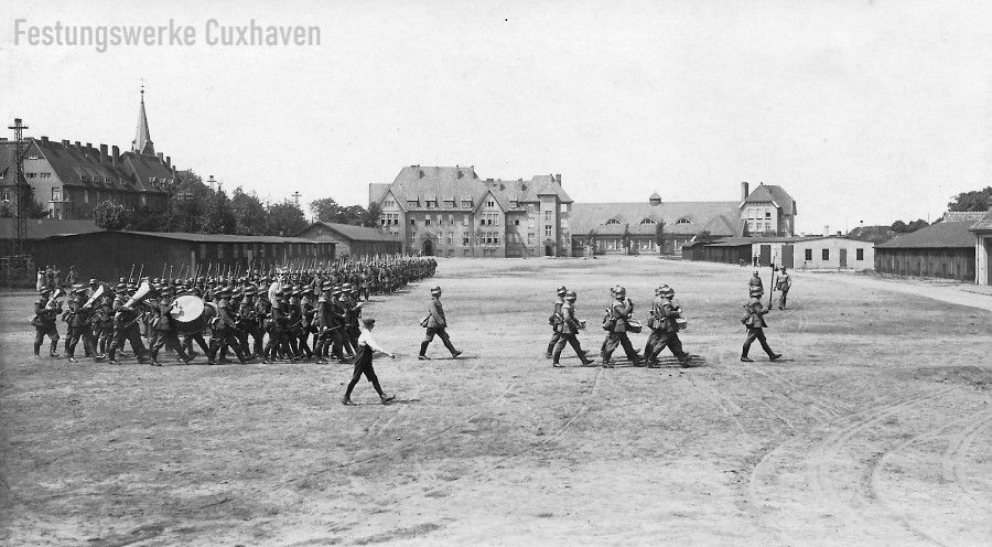 Marinesoldaten auf dem Exerzierplatz, das Foto wurde vor 1908 aufgenommen. Die Grimmershörnkaserne ist zu diesem Zeitpunkt noch nicht gebaut. Allerdings steht die Exerzierhalle schon.