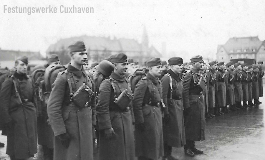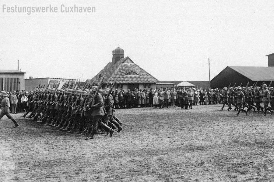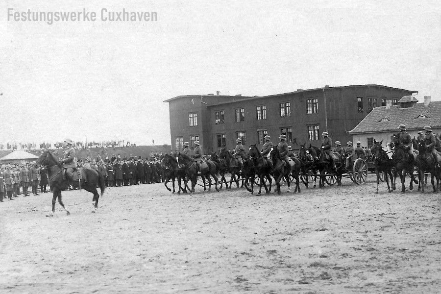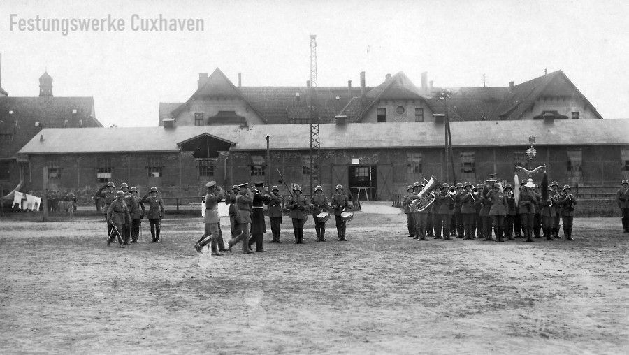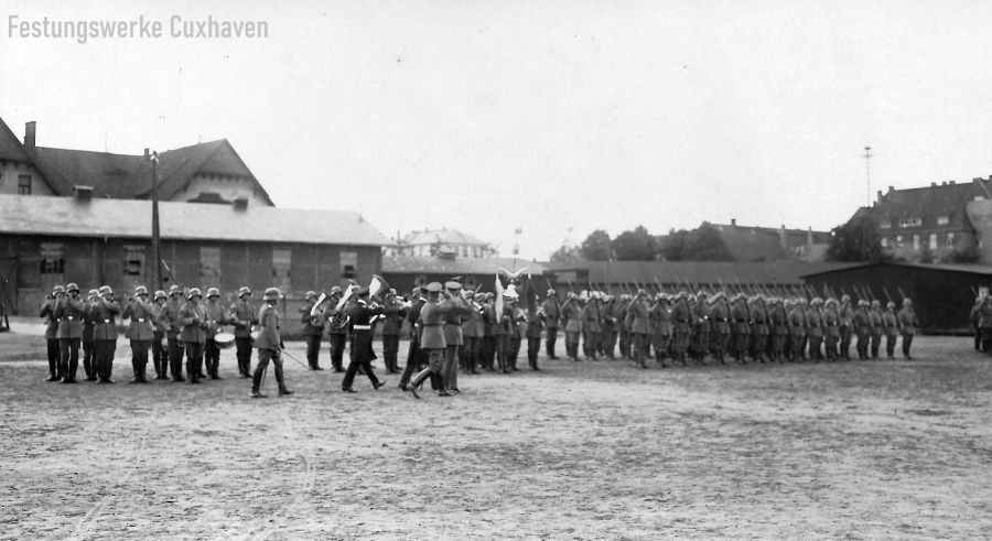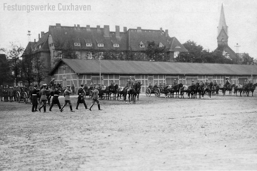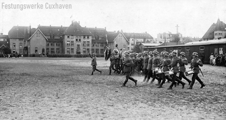 Marinesoldaten auf dem Exerzierplatz, das Foto wurde vor 1908 aufgenommen. Die Grimmershörnkaserne ist zu diesem Zeitpunkt noch nicht gebaut. Allerdings steht die Exerzierhalle schon.