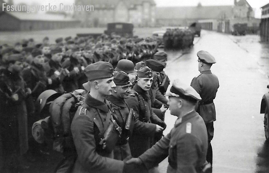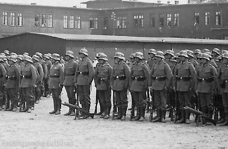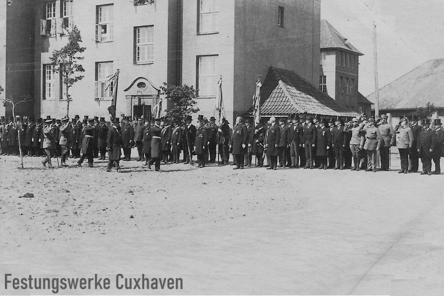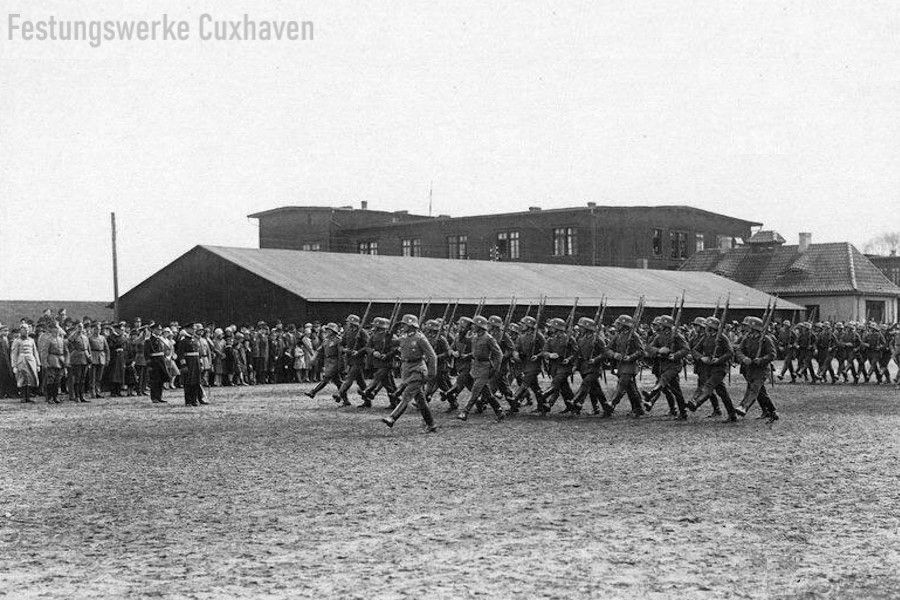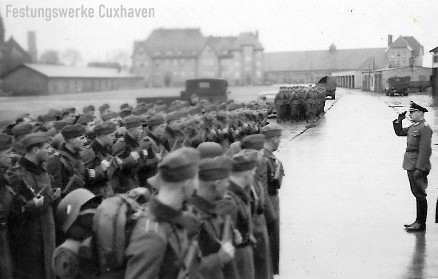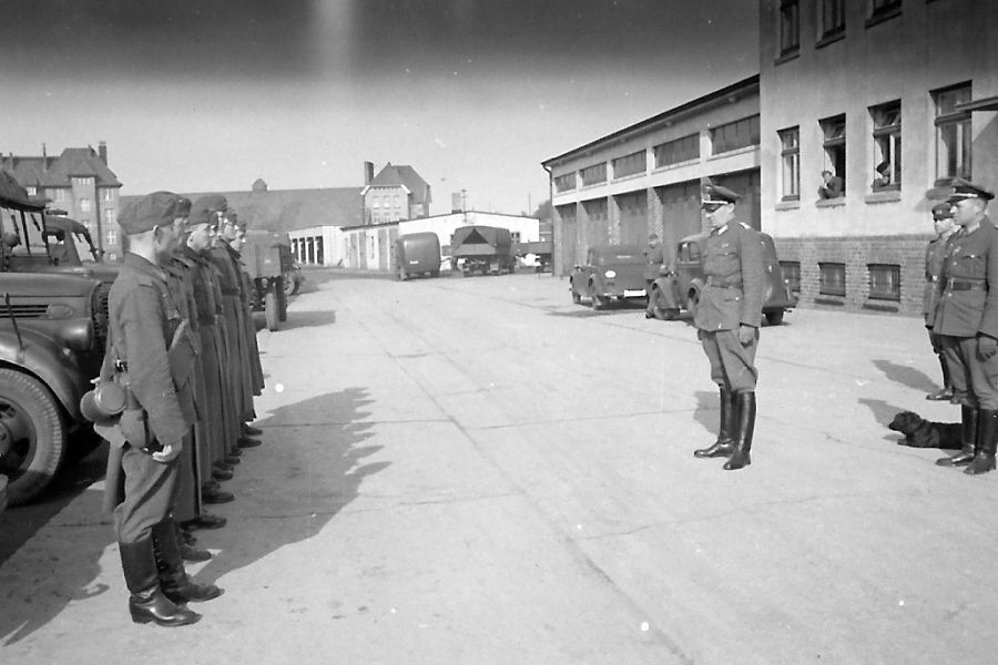 Kommandant Zollenkopf inspiziert 1939 die Kräfte der Kriegsmarine. Im Hintergrund die Hallen der KFZ.-Bereitschaft.