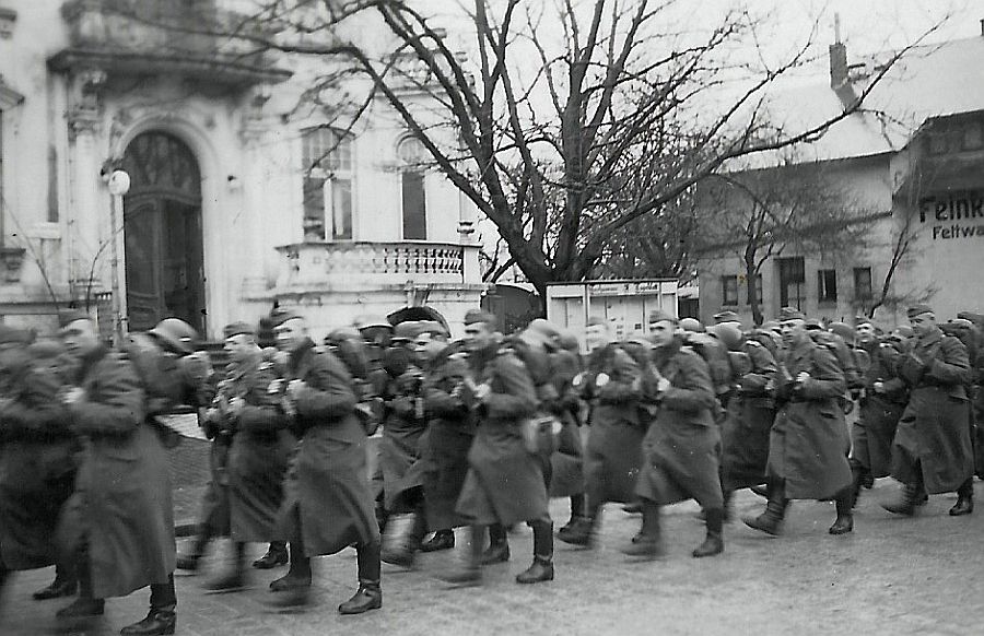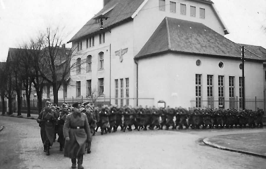 Kommandant Zollenkopf spricht zu seinen Leuten, im Hintergrund die "Große Wetternkaserne",
