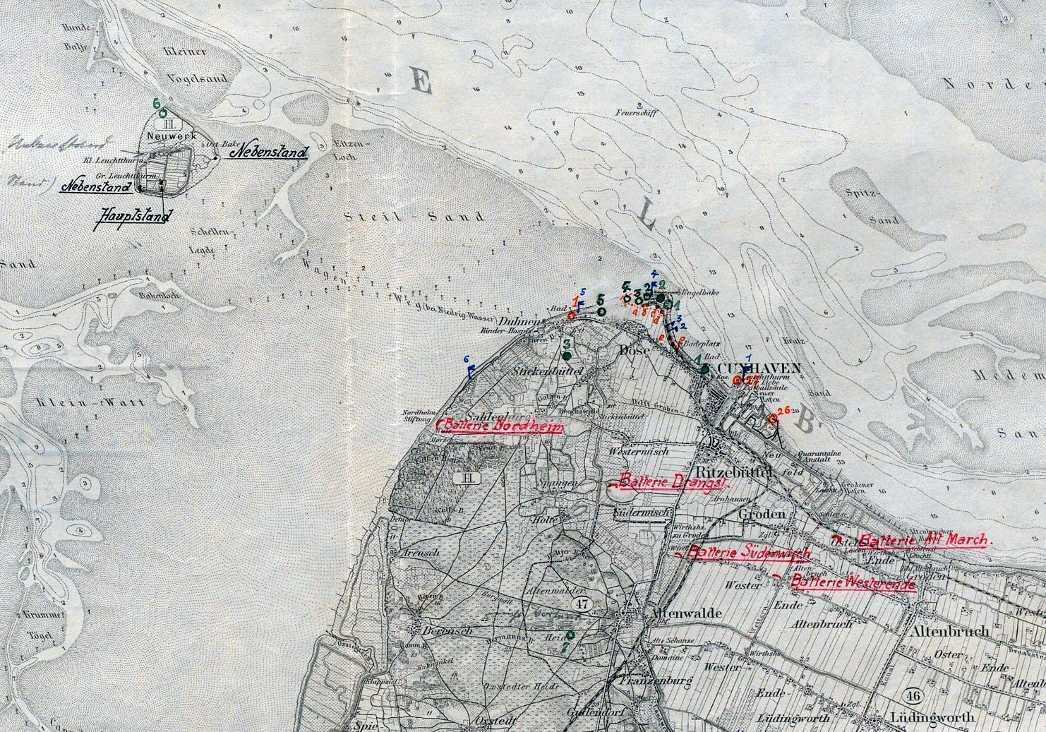 Die Feuerkraft der Cuxhavener Strandbatterien ging in dieser Zeit von 2 x 28 cm, 15 x 72-Pfdr. (21 cm), 10 x 24-Pfdr. (15 cm), 11 x 6-Pfdr. (9 cm) Geschützen sowie 6 - 50-Pfdr. Mörsern aus.