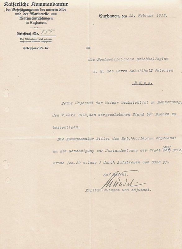Kaiser Wilhelm der Zweite mit der Staatsyacht "Hohenzollern" die Marinestadt Cuxhaven. In dem Rahmen führte er nach Berichten auch eine Besichtigung der Flakstellung Duhnen/Steinmarne durch.