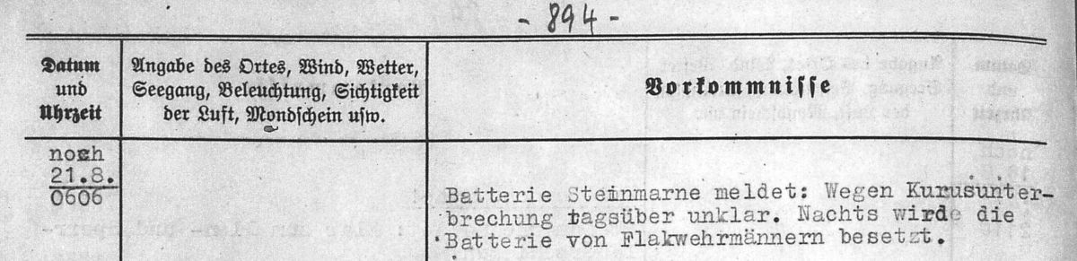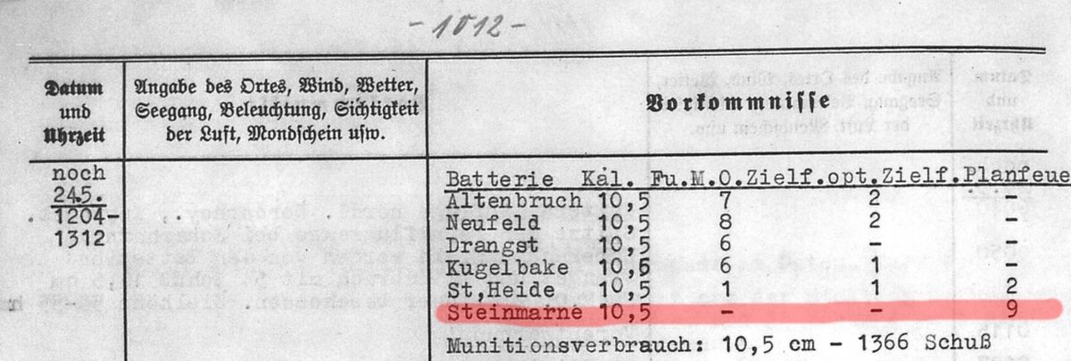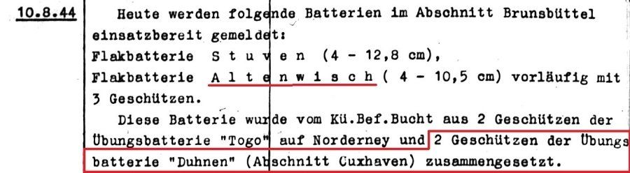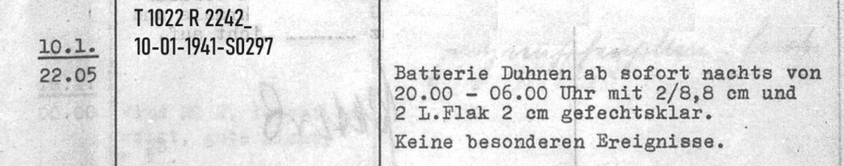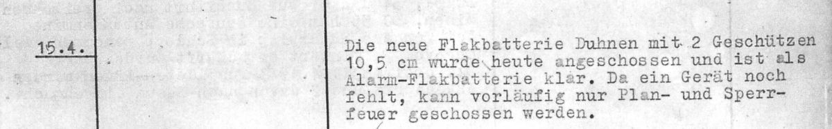 Bereits am 10.01.1941 wird die Batterie Duhnen allerdings bereits mit 2 x 8,8 cm und 2 x 2 cm in einem Kriegstagebuch Nachts einsatzklar erwähnt. Vermutlich handelt es sich dabei aber um die Geschütze der Übungbatterie, die außerhalb der Lehrgangszeiten zum offiziellen Flakschutz genutzt wurden. Ab 06.05.1942 waren in der Stellung eine 3,7 cm SK und eine 2 cm C30 schießklar aufgebaut.