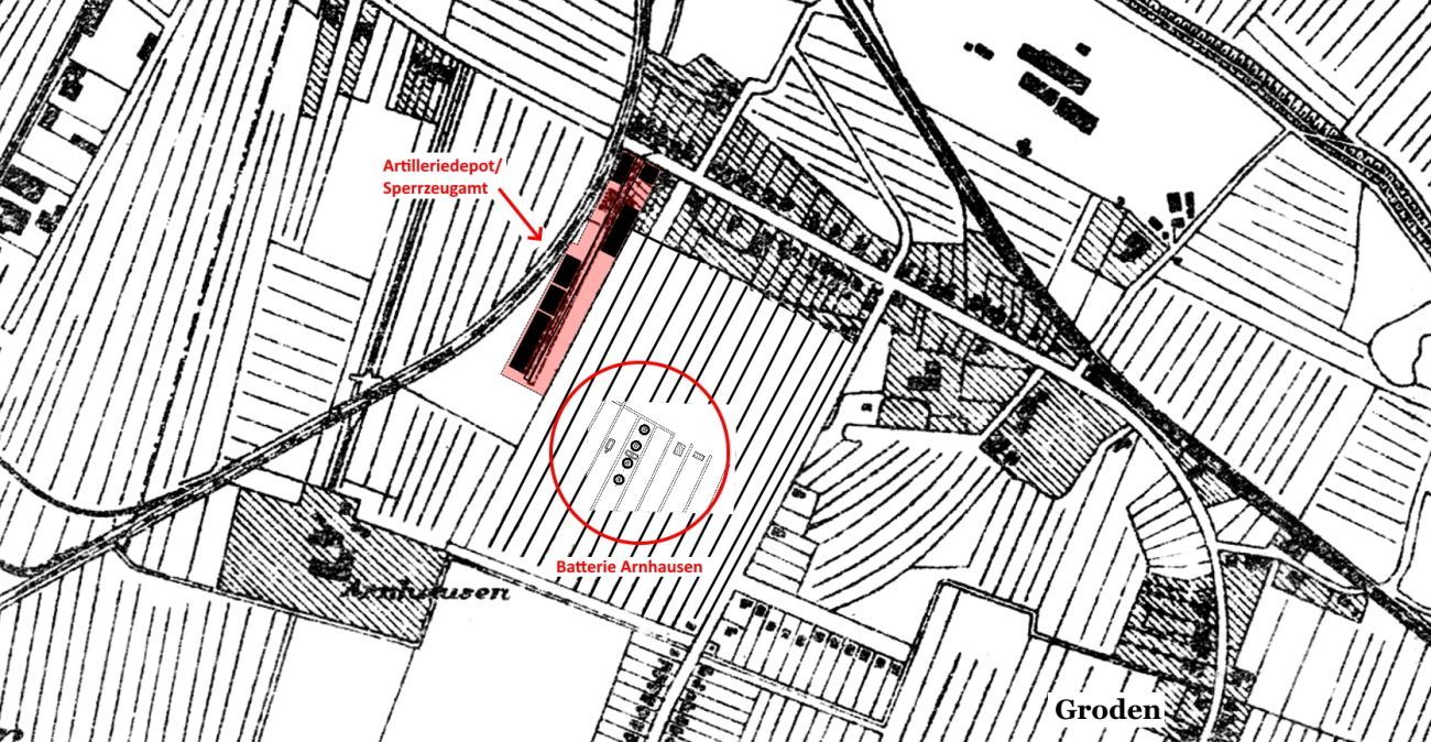 Flakbatterie Arnhausen soll sich nach Unterlagen etwa 130 Meter östlich des ehemaligen Artilleriedepot/Sperrzeugamt an der Grodener Chaussee befunden haben. Benannt wurde die Stellung nach einer ehemaligen Hofstelle, die sich direkt in deren Nähe befunden hatte. Sie bestand aus vier Geschützen, einem Kommandeurstand, dem östlich liegenden Munitionsraum, einer Mannschaftsbaracke und einem Material- und Geräteschuppen.
