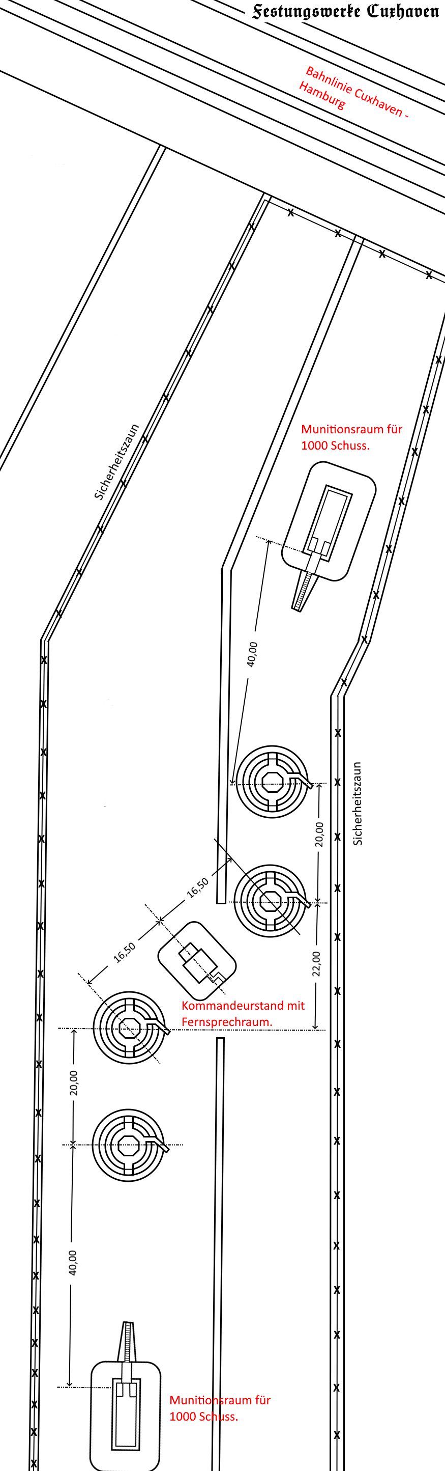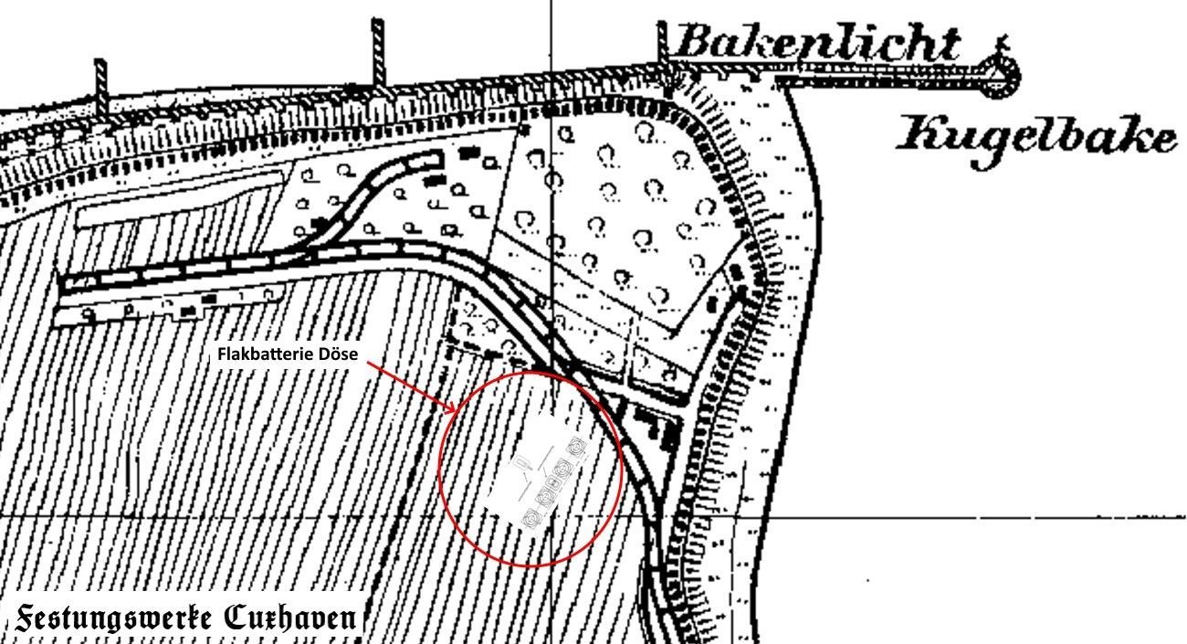 Spielplatzes am Kurpark in Döse. Die Geschütze waren lineal im Abstand von 12 Metern aufgestellt, mit dem Kommandeurstand in der Mitte. Ein Munitionsbunker für die Geschosse war nicht angegeben, ebenso keine Mannschaftsbaracken für das Bedienungspersonal. Vermutlich wurde auf Grund der Nähe zum Fort, die Räumlichkeiten dort genutzt.