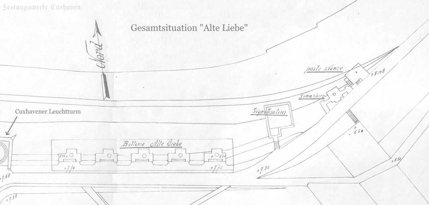 zwischen dem Cuxhavener Leuchtturm und dem Semaphor in den kleinen Schutzdeich verbaut. Sie bestand aus vier 8,8 cm. Geschützen im Abstand von 12 Metern, die in offener Bauweise auf je einem Sockelfundament aufgestellt waren. Die Hauptaufgabe der Stellung, war anfänglich die Unterstützung der Großbatterien durch Schnellfeuer gegen in die Elbmündung vordringenden Seeziele.