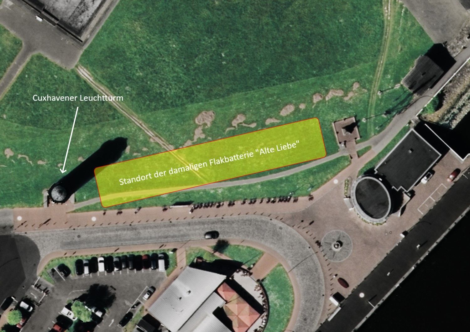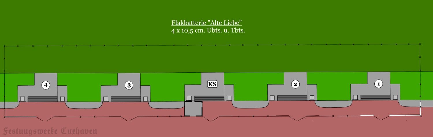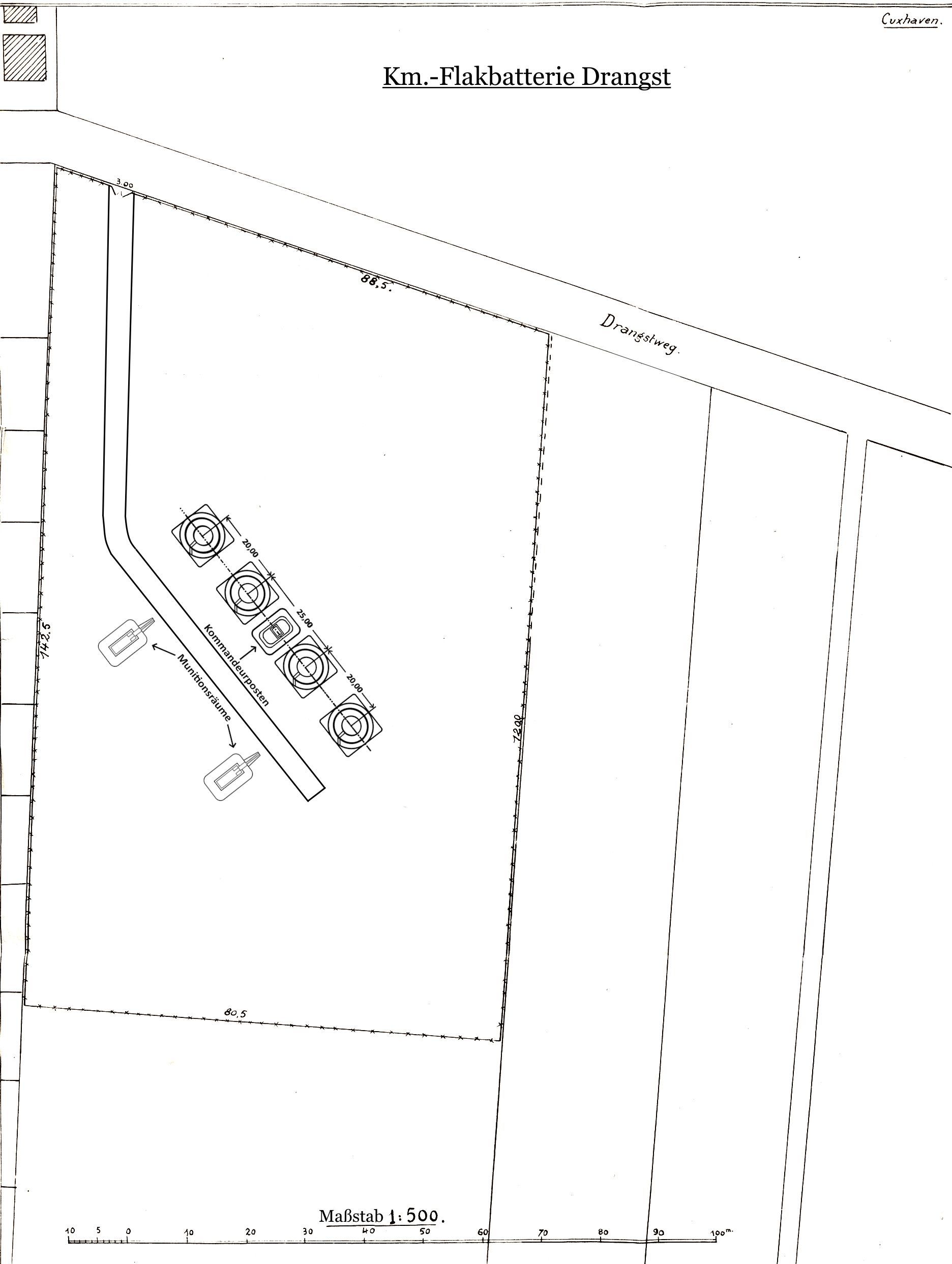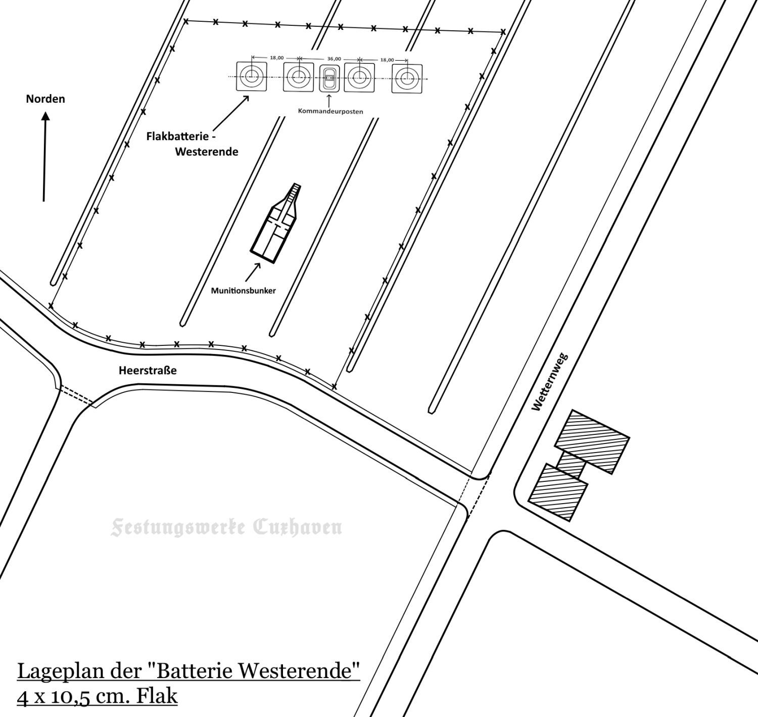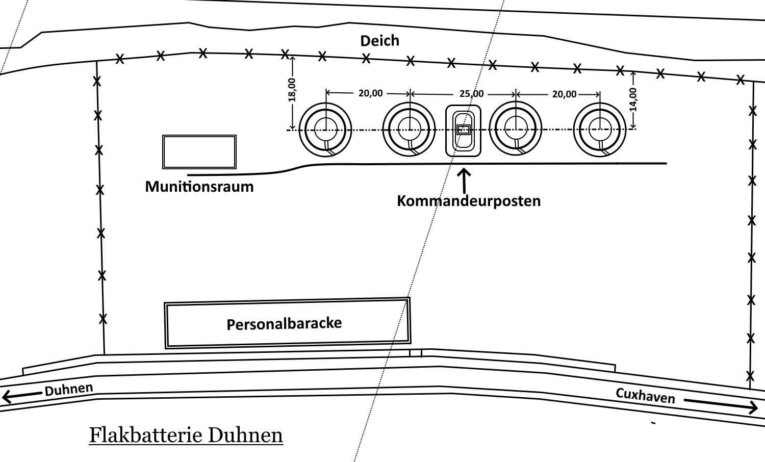 Adventure-Golfplatzes an der Cuxhavener Straße. Sie bestand aus 4 x 8,8 cm. Kanonen, die im Abstand von 20 Metern auf runden Betonsockeln standen. In der Mitte davon befand sich der Kommandeurstand, von dem das Schießen geleitet wurde. Vor und hinter der in einer Linie aufgestellten Geschütze, befand sich jeweils eine ca. 1,50 Meter hohe Erdbrüstung als Splitterschutz. Links neben der Batterie befand sich der Munitionsraum, zur Straße hin stand eine Baracke für das Bedienungspersonal. Umgeben war die gesamte Anlage von einem 1,30 Meter hohen Stacheldrahtverhau.