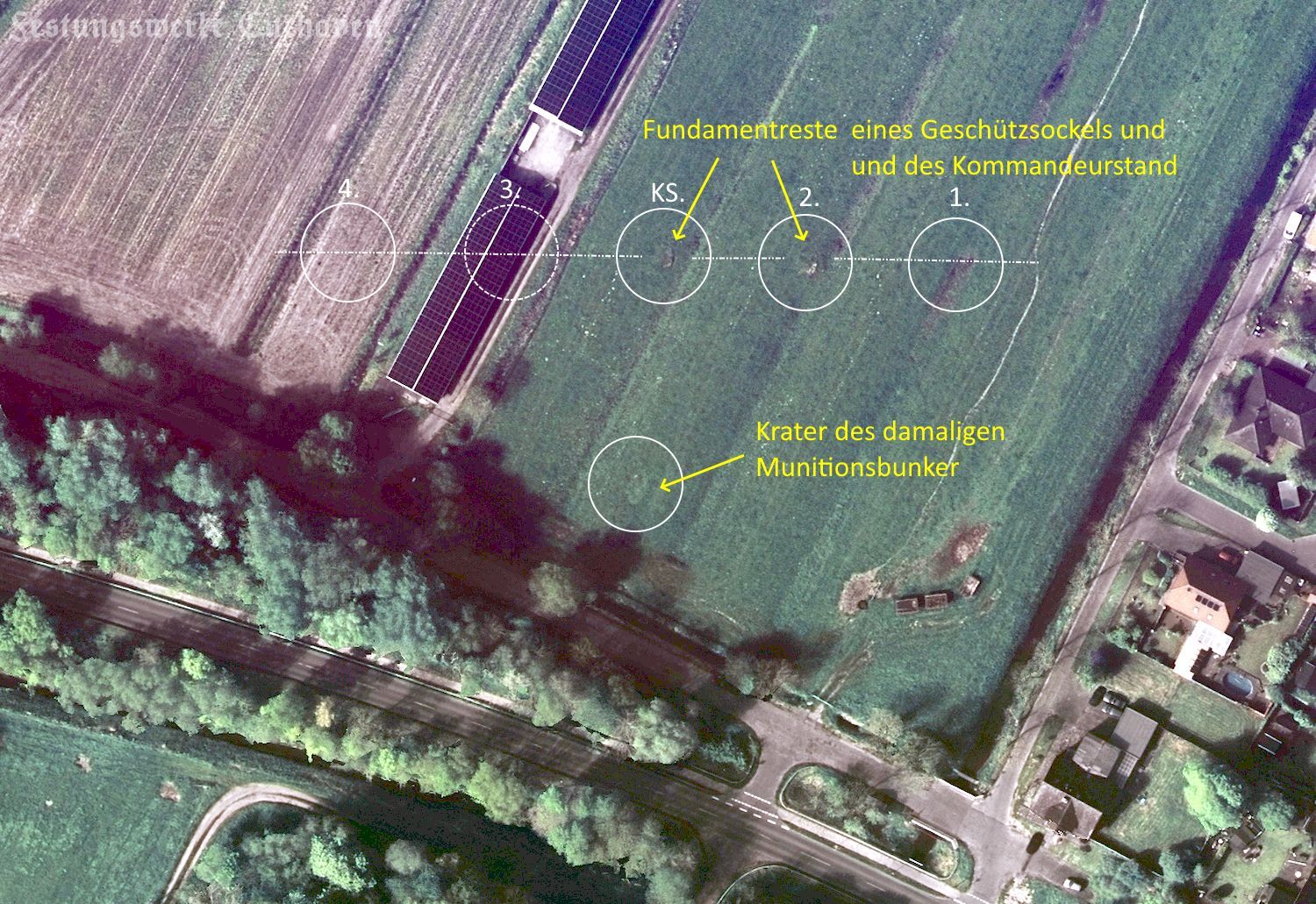 Eine Vergrößerung der Aufnahme zeigt die Anordnung der Geschützfundamente der ehemaligen Flakbatterie.