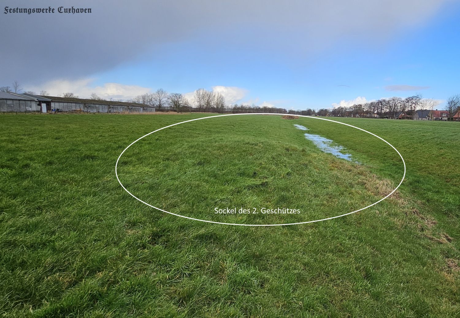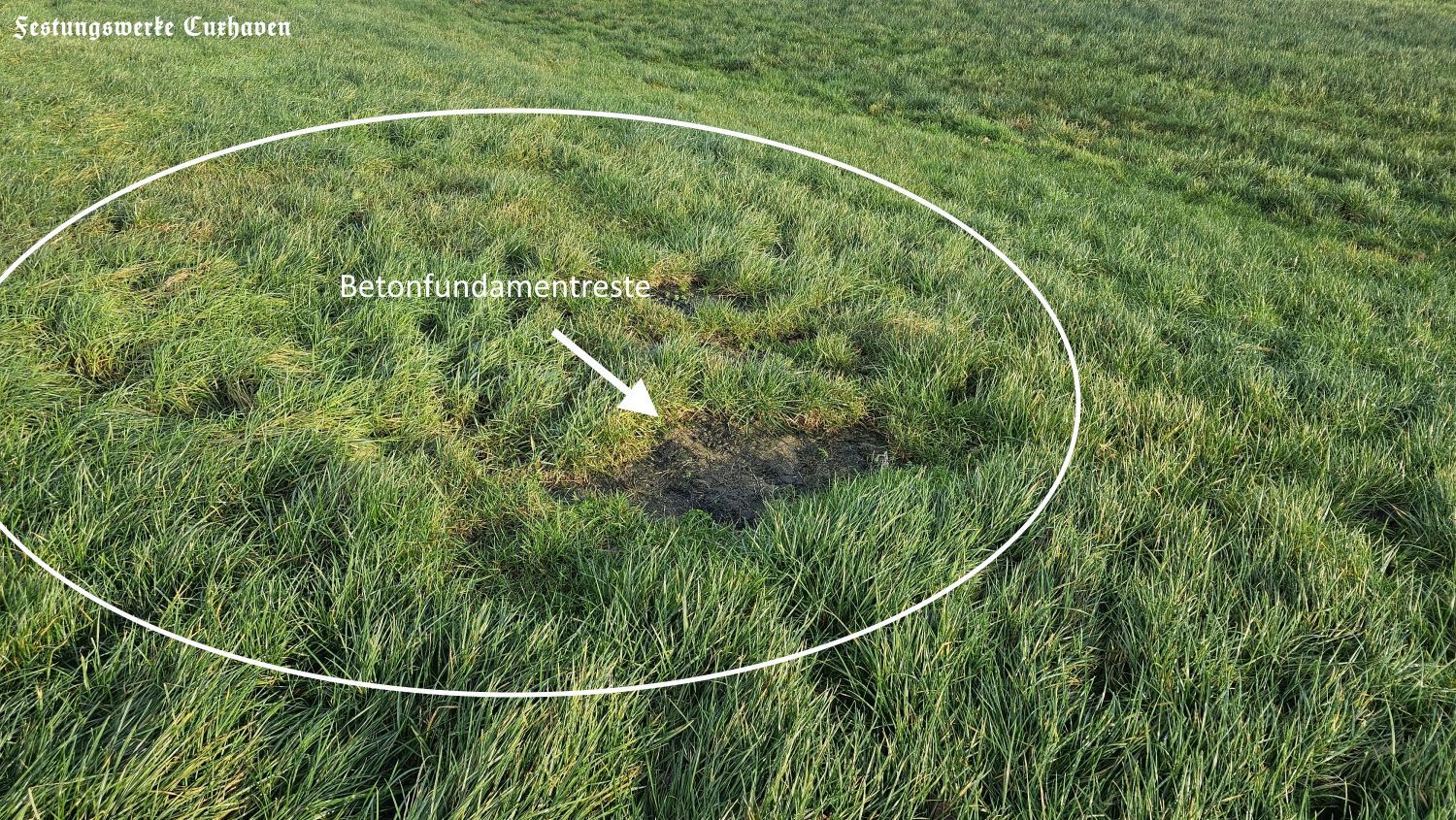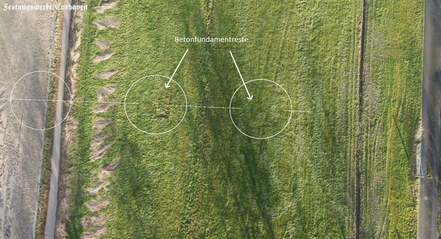 Eine Aufnahme von 2023. Noch heutzutage lassen sich zwei der Fundamente auf der als Rinderweide genutzten Fläche gut erkennen.