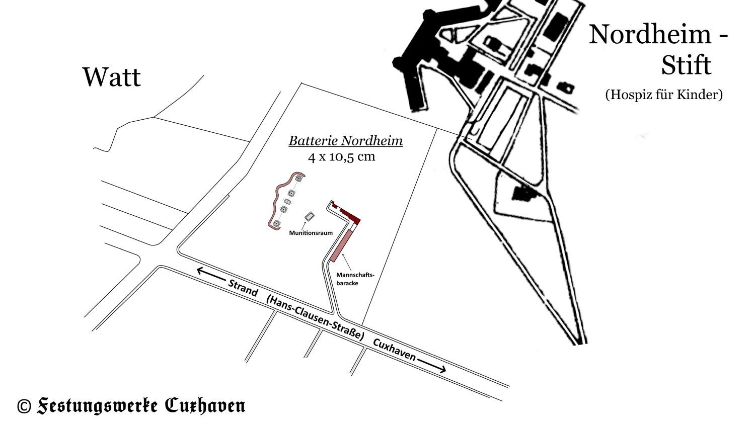 Die Luftabwehrstellung lag während der Kriegzeit WK.1 auf einer Weide an der heutigen Heerstraße / Ecke Am Böhlgraben. Sie war von der Bauweise identisch mit den Batterien Nordheim, Drangst und Westerende.