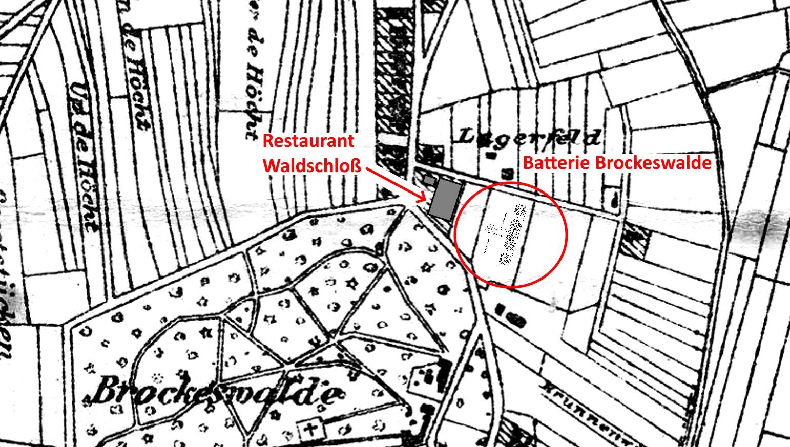 Als Lage der Batterie Brockeswalde wird der Standort direkt hinter der damaligen Gaststätte "Waldschoss" beschrieben. Heutzutage befindet sich dort der Sportplatz, die Stellung lag etwa in der westlichen Hälft des Spielfelds. Sie war mit vier Geschützen, einem Kommandeurstand und einem Munitionsbunker linear aufgestellt. Der Hinweis auf die Stellung kommt nur aus einem Dokument, das sich im Bundesarchiv in Freiburg/BWG. befindet. In den achtziger Jahren entfernte die Fa.Plambeck nach Aussage eines Zeitzeugen auf dem Sportplatz Brockeswalde noch Reste einiger Betonfundamente, die aus heutiger Sicht eventuell zur Flakbatterie gehört haben könnten.