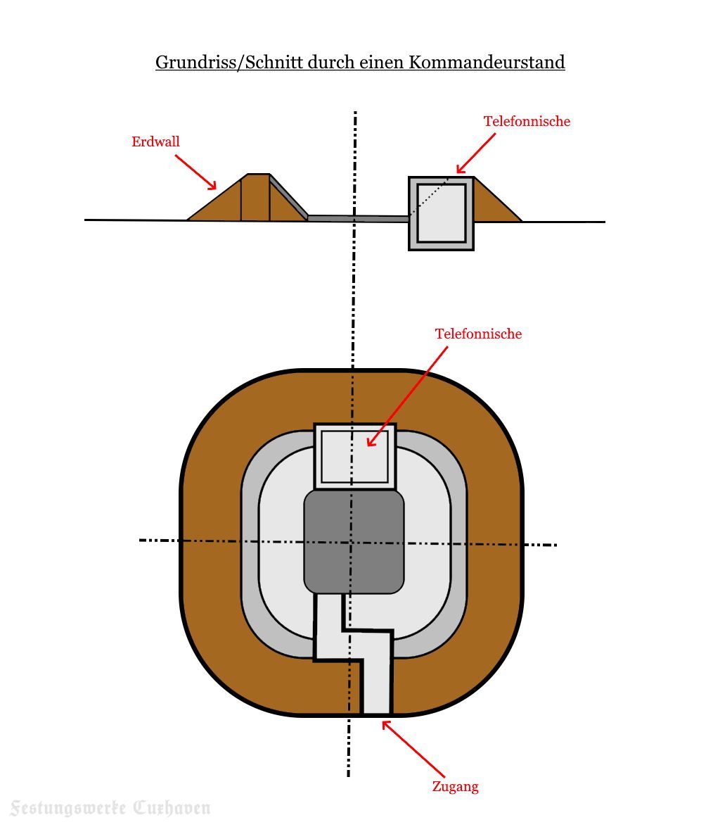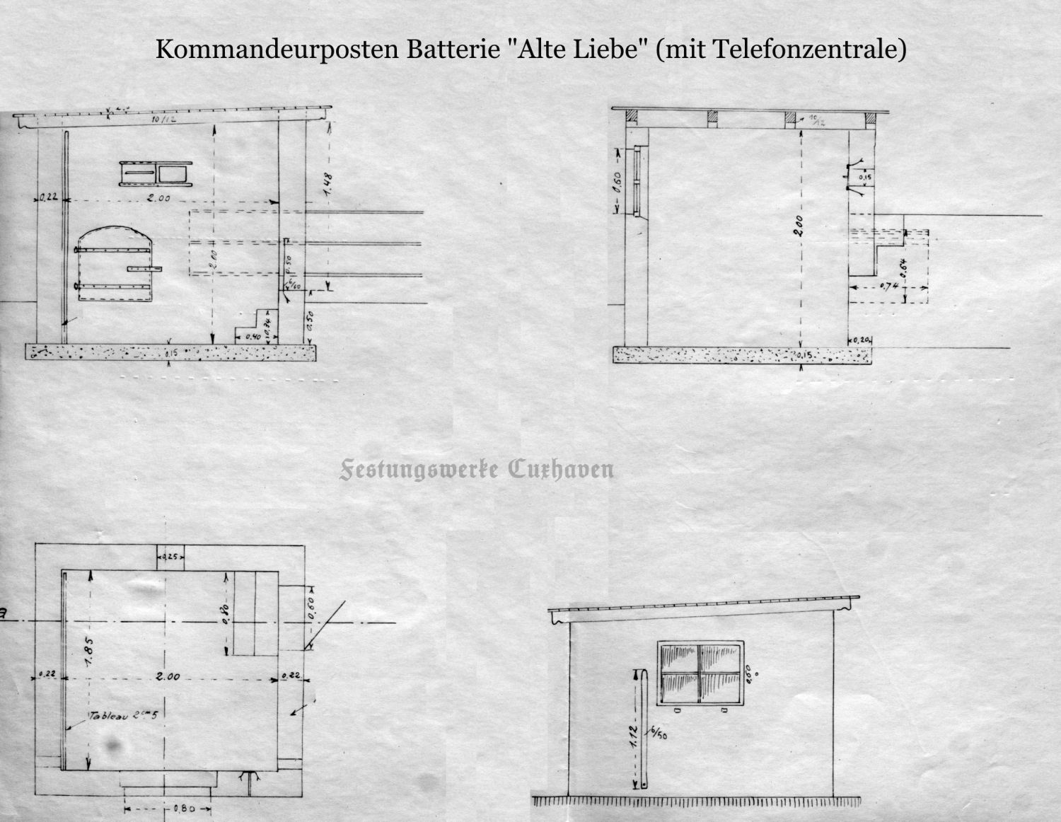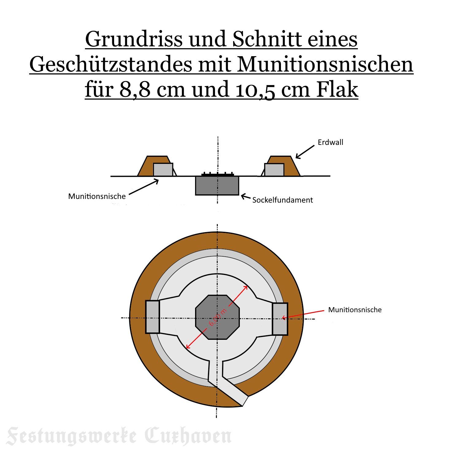 Grundriss und Schnitt durch eine Geschützstellung für eine Flak, wie sie im Abschnitt Cuxhaven zur Zeit des ersten Weltkriegs verwendet wurde.