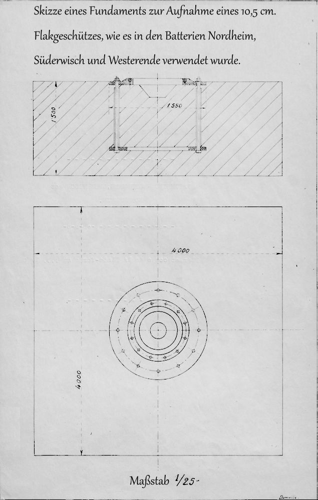 Skizze eines Fundaments zur Aufnahme eines 10,5 cm. Flakgeschütz, wie es in den Batterien Nordheim, Süderwisch und Westerende verwendet wurde.