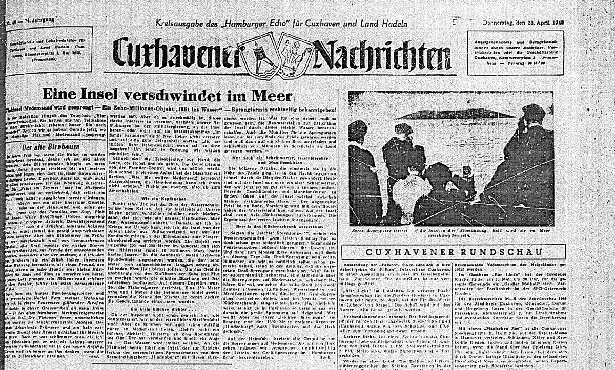 Kurz vor der Sprengung durch die englischen Besatzungstruppen. Leider ist die Qulität der Aufnahme schlecht. Text unter dem Foto: "Sechs Augenpaare starren auf die Insel in der Elbmündung. Bald wird sie im Meer verschwunden sein".