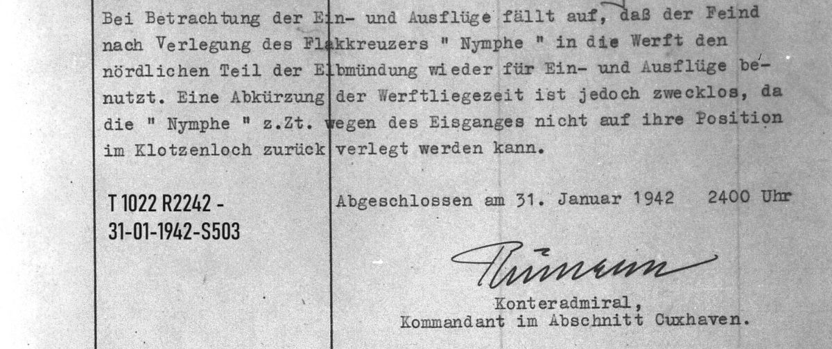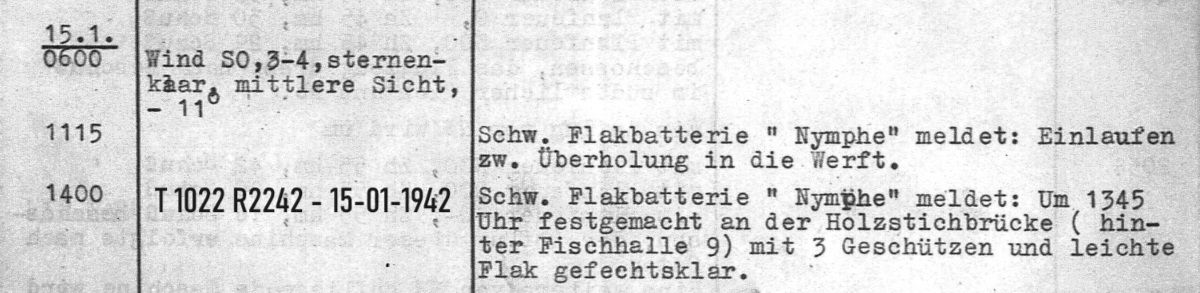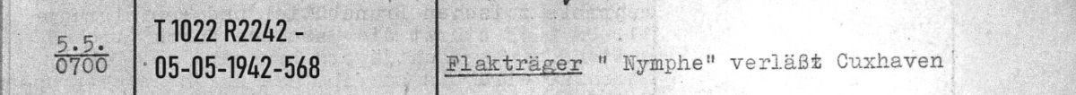 Am 05.05.1942 verließ die schwimmende Flakbatterie "Nymphe" nach einem Werftaufenthalt Cuxhaven dann allerdings wieder und verholte nach Tromsö/Norwegen. Hier wurde es zum Schutz des Schlachtschiff "Tirpitz" eingesetzt, um die immer intensiver werdenden Luftangriffe gegen die "Königin des Nordens" abzuwehren.