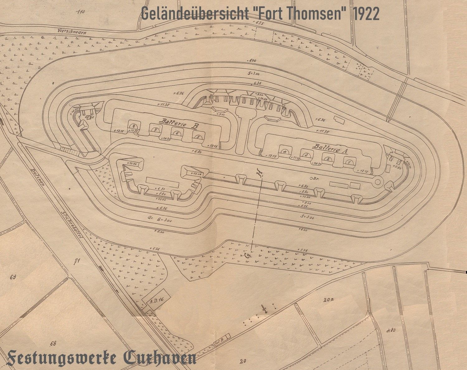 Eine Luftaufnahme von 1918 mit Blickrichtung Süden (Stickenbüttel), zeigt das Fort Thomsen. Es ist die einzige Aufnahme aus der Zeit zwischen 1905 und 1920 überhaupt.
