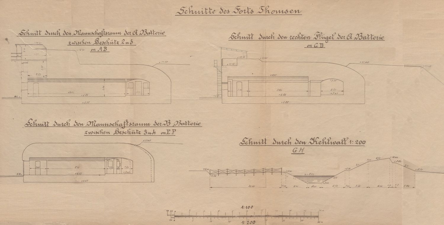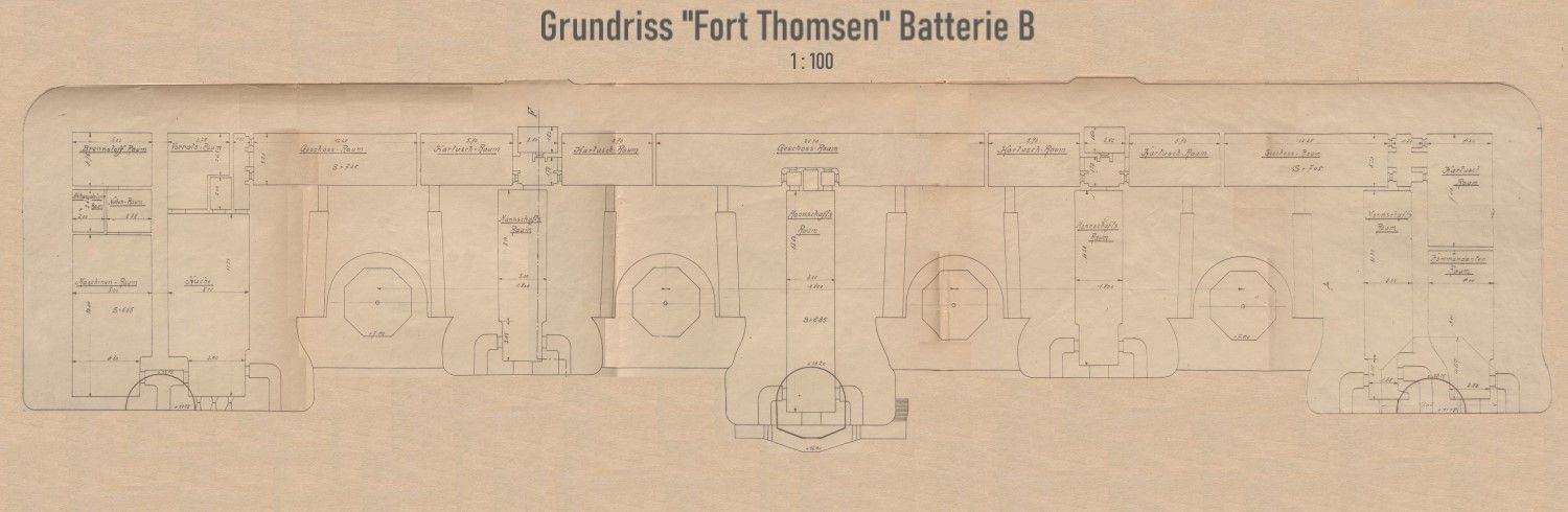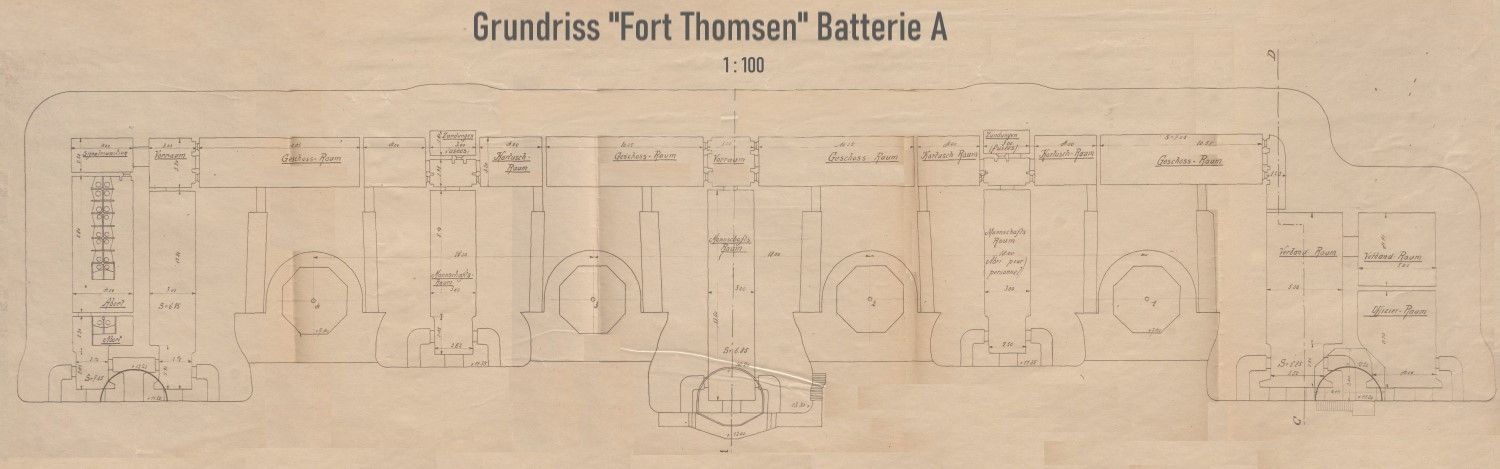Fort Thomsen bestand aus zwei geradlinigen Schwerbetonbatterien ohne Bewehrung (Batterie